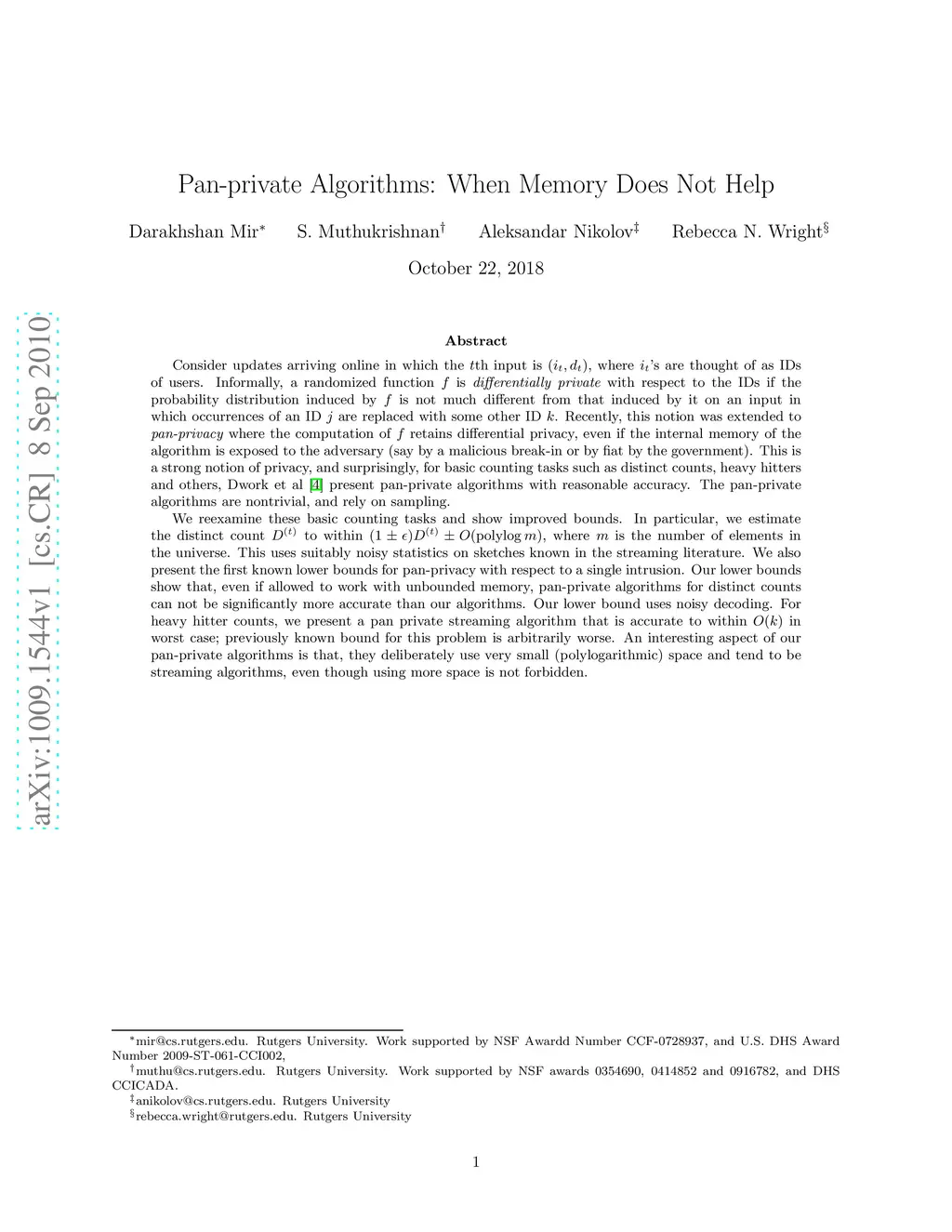 Consider updates arriving online in which the th input is , where 's are thought of as IDs of users. Informally, a randomized function is {\em differentially private} with respect to the IDs if the probability distribution induced by is not much different from that induced by it on an input in which occurrences of an ID are replaced with some other ID Recently, this notion was extended to {\em pan-privacy} where the computation of retains differential privacy, even if the internal memory of the algorithm is exposed to the adversary (say by a malicious break-in or by fiat by the government). This is a strong notion of privacy, and surprisingly, for basic counting tasks such as distinct counts, heavy hitters and others, Dwork et al~\cite{dwork-pan} present pan-private algorithms with reasonable accuracy. The pan-private algorithms are nontrivial, and rely on sampling. We reexamine these basic counting tasks and show improved bounds. In particular, we estimate the distinct count to within , where is the number of elements in the universe. This uses suitably noisy statistics on sketches known in the streaming literature. We also present the first known lower bounds for pan-privacy with respect to a single intrusion. Our lower bounds show that, even if allowed to work with unbounded memory, pan-private algorithms for distinct counts can not be significantly more accurate than our algorithms. Our lower bound uses noisy decoding. For heavy hitter counts, we present a pan private streaming algorithm that is accurate to within in worst case; previously known bound for this problem is arbitrarily worse. An interesting aspect of our pan-private algorithms is that, they deliberately use very small (polylogarithmic) space and tend to be streaming algorithms, even though using more space is not forbidden.