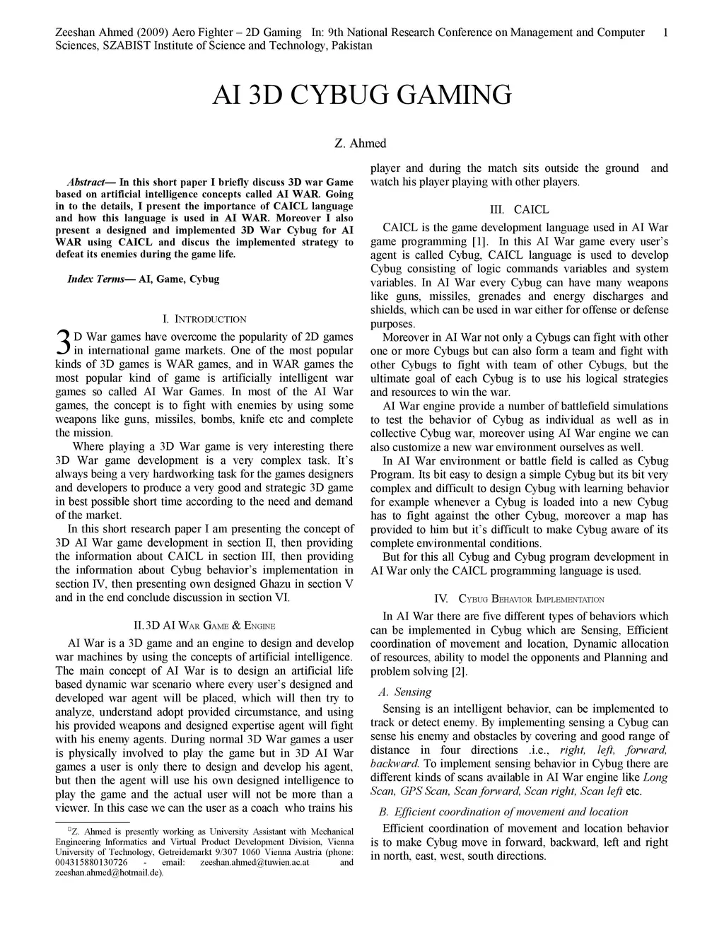 In this short paper I briefly discuss 3D war Game based on artificial intelligence concepts called AI WAR. Going in to the details, I present the importance of CAICL language and how this language is used in AI WAR. Moreover I also present a designed and implemented 3D War Cybug for AI WAR using CAICL and discus the implemented strategy to defeat its enemies during the game life.