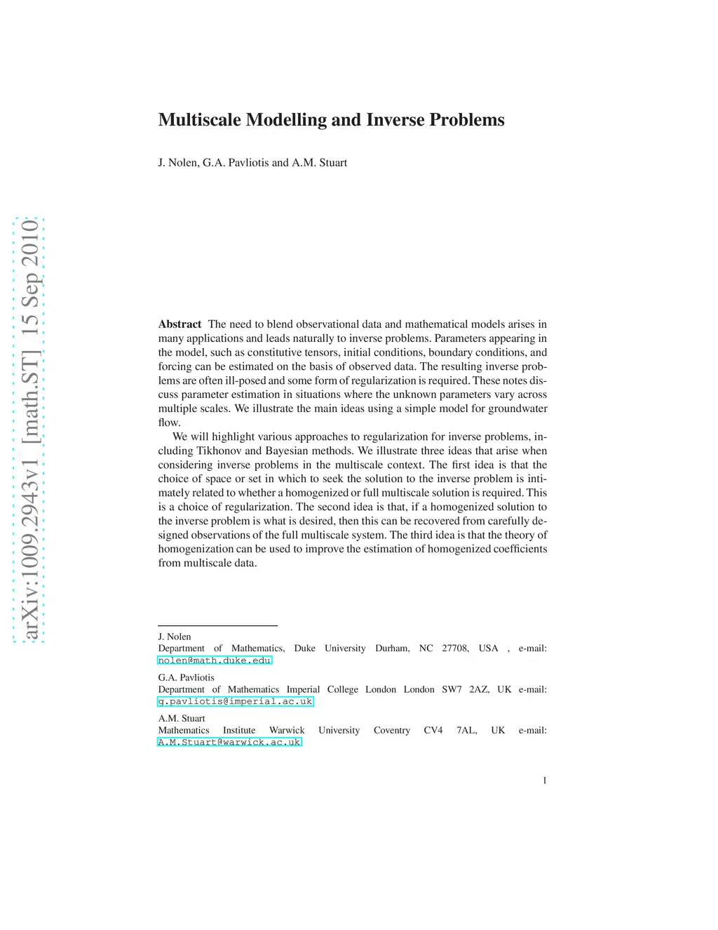 The need to blend observational data and mathematical models arises in many applications and leads naturally to inverse problems. Parameters appearing in the model, such as constitutive tensors, initial conditions, boundary conditions, and forcing can be estimated on the basis of observed data. The resulting inverse problems are often ill-posed and some form of regularization is required. These notes discuss parameter estimation in situations where the unknown parameters vary across multiple scales. We illustrate the main ideas using a simple model for groundwater flow. We will highlight various approaches to regularization for inverse problems, including Tikhonov and Bayesian methods. We illustrate three ideas that arise when considering inverse problems in the multiscale context. The first idea is that the choice of space or set in which to seek the solution to the inverse problem is intimately related to whether a homogenized or full multiscale solution is required. This is a choice of regularization. The second idea is that, if a homogenized solution to the inverse problem is what is desired, then this can be recovered from carefully designed observations of the full multiscale system. The third idea is that the theory of homogenization can be used to improve the estimation of homogenized coefficients from multiscale data.