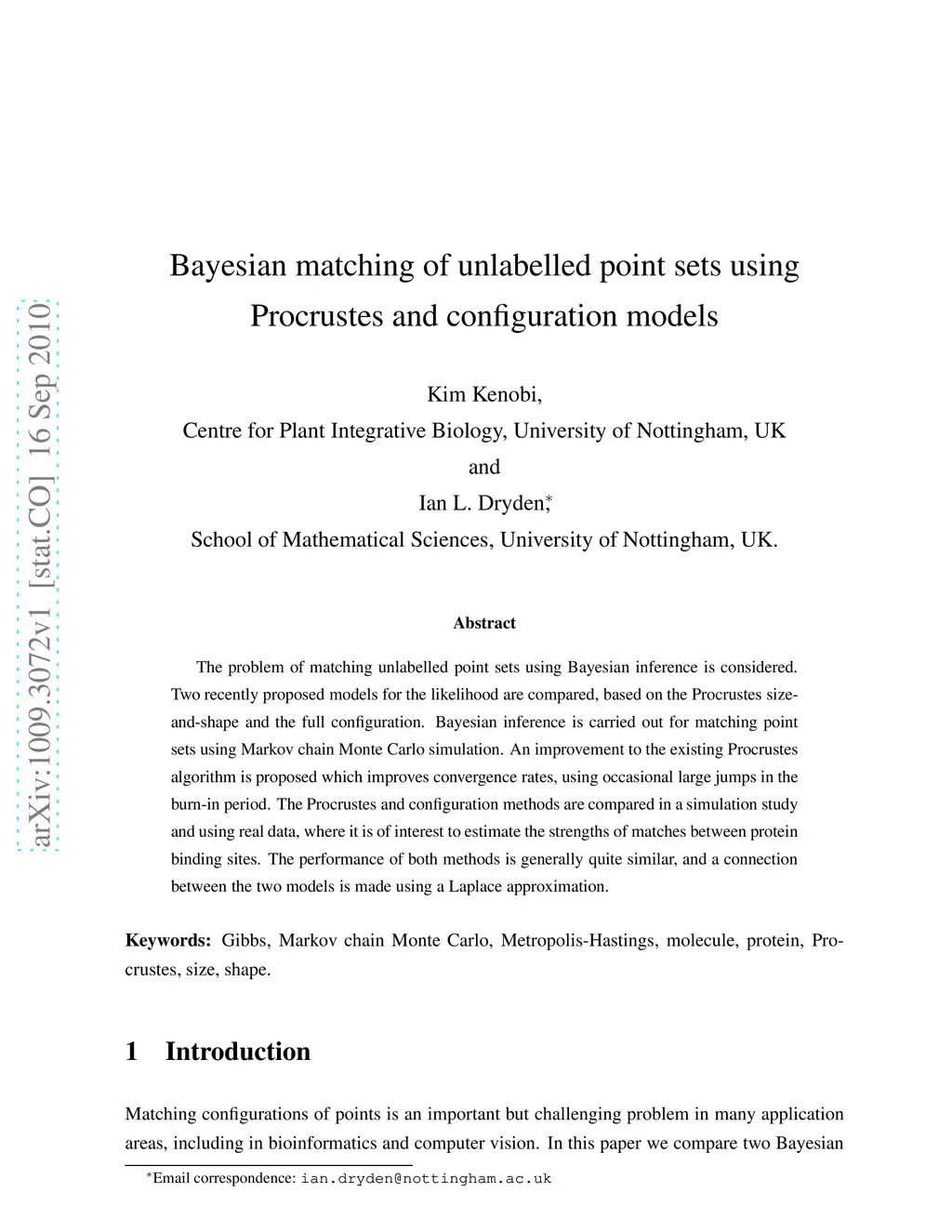 The problem of matching unlabelled point sets using Bayesian inference is considered. Two recently proposed models for the likelihood are compared, based on the Procrustes size-and-shape and the full configuration. Bayesian inference is carried out for matching point sets using Markov chain Monte Carlo simulation. An improvement to the existing Procrustes algorithm is proposed which improves convergence rates, using occasional large jumps in the burn-in period. The Procrustes and configuration methods are compared in a simulation study and using real data, where it is of interest to estimate the strengths of matches between protein binding sites. The performance of both methods is generally quite similar, and a connection between the two models is made using a Laplace approximation.