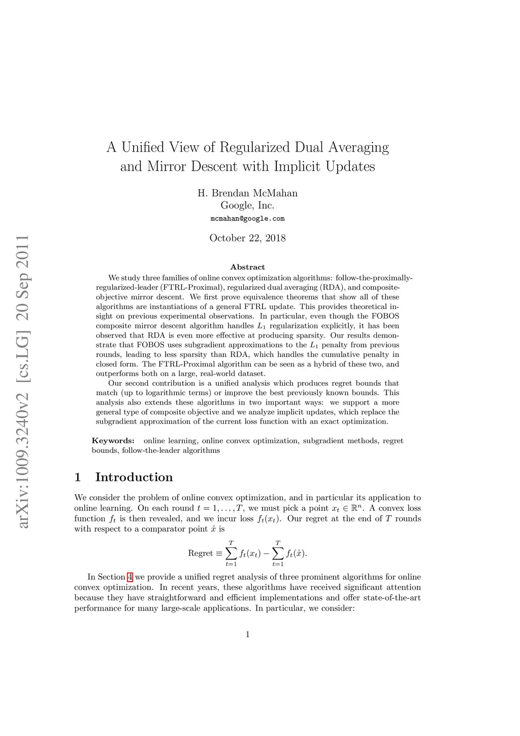We study three families of online convex optimization algorithms: follow-the-proximally-regularized-leader (FTRL-Proximal), regularized dual averaging (RDA), and composite-objective mirror descent. We first prove equivalence theorems that show all of these algorithms are instantiations of a general FTRL update. This provides theoretical insight on previous experimental observations. In particular, even though the FOBOS composite mirror descent algorithm handles L1 regularization explicitly, it has been observed that RDA is even more effective at producing sparsity. Our results demonstrate that FOBOS uses subgradient approximations to the L1 penalty from previous rounds, leading to less sparsity than RDA, which handles the cumulative penalty in closed form. The FTRL-Proximal algorithm can be seen as a hybrid of these two, and outperforms both on a large, real-world dataset. Our second contribution is a unified analysis which produces regret bounds that match (up to logarithmic terms) or improve the best previously known bounds. This analysis also extends these algorithms in two important ways: we support a more general type of composite objective and we analyze implicit updates, which replace the subgradient approximation of the current loss function with an exact optimization.