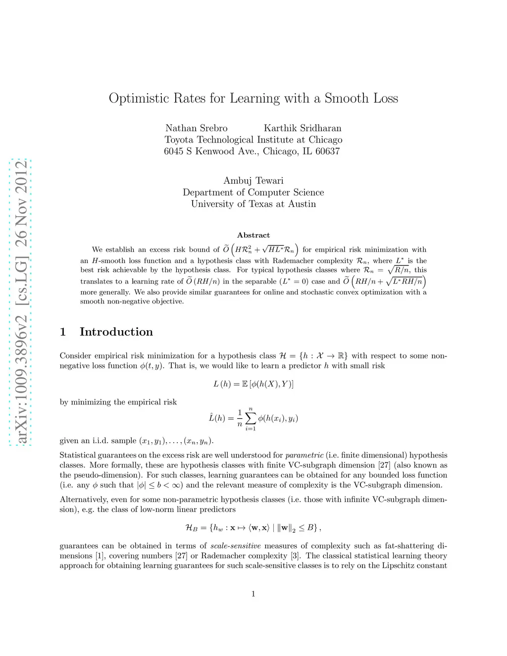 We establish an excess risk bound of O(H R_n^2 + R_n \sqrt{H L*}) for empirical risk minimization with an H-smooth loss function and a hypothesis class with Rademacher complexity R_n, where L* is the best risk achievable by the hypothesis class. For typical hypothesis classes where R_n = \sqrt{R/n}, this translates to a learning rate of O(RH/n) in the separable (L*=0) case and O(RH/n + \sqrt{L^* RH/n}) more generally. We also provide similar guarantees for online and stochastic convex optimization with a smooth non-negative objective.