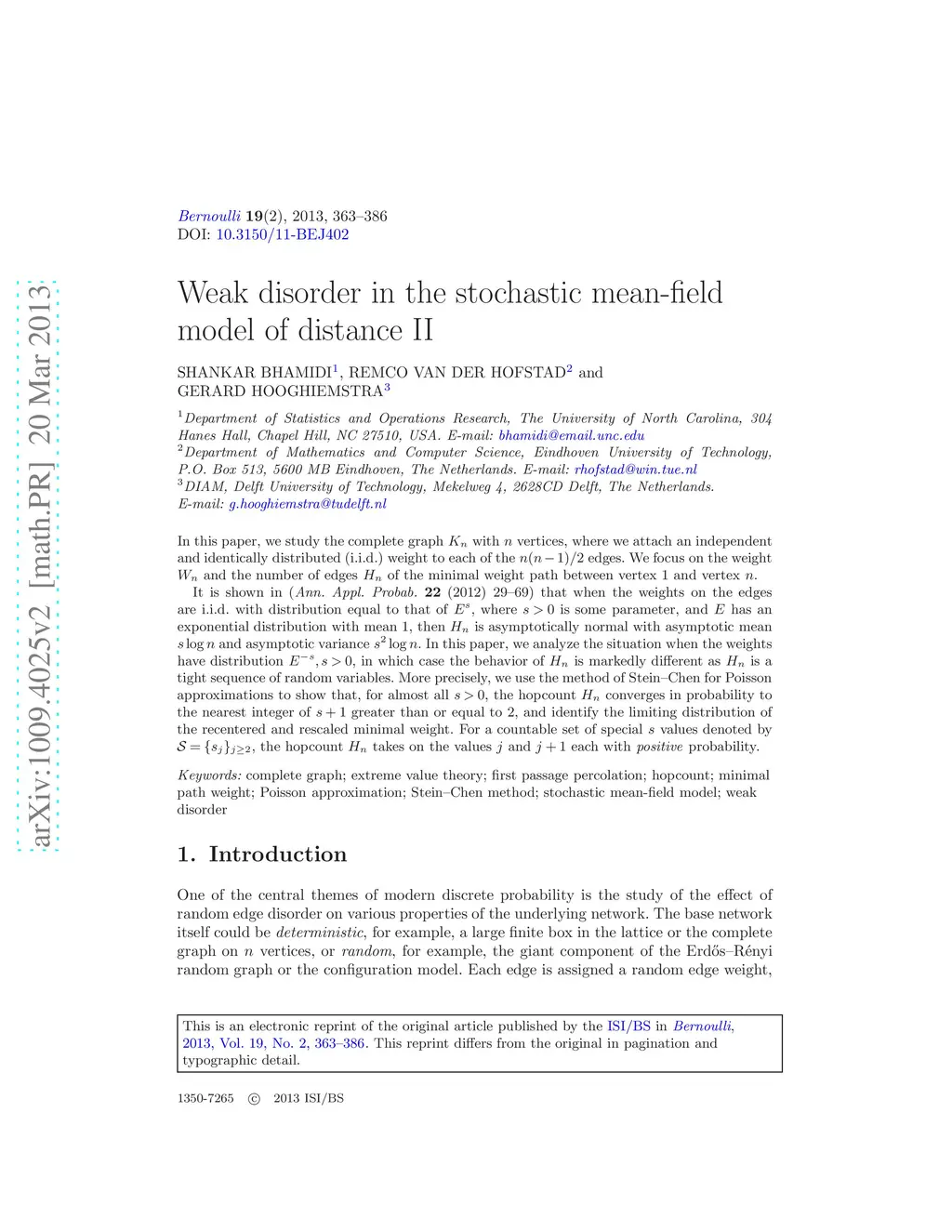 In this paper, we study the complete graph with n vertices, where we attach an independent and identically distributed (i.i.d.) weight to each of the n(n-1)/2 edges. We focus on the weight and the number of edges of the minimal weight path between vertex 1 and vertex n. It is shown in (Ann. Appl. Probab. 22 (2012) 29-69) that when the weights on the edges are i.i.d. with distribution equal to that of , where is some parameter, and E has an exponential distribution with mean 1, then is asymptotically normal with asymptotic mean and asymptotic variance . In this paper, we analyze the situation when the weights have distribution , in which case the behavior of is markedly different as is a tight sequence of random variables. More precisely, we use the method of Stein-Chen for Poisson approximations to show that, for almost all , the hopcount converges in probability to the nearest integer of s+1 greater than or equal to 2, and identify the limiting distribution of the recentered and rescaled minimal weight. For a countable set of special s values denoted by , the hopcount takes on the values j and j+1 each with positive probability.