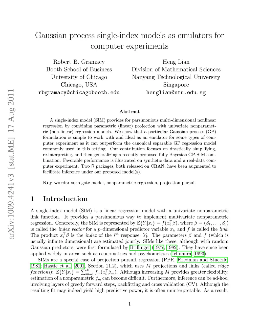 A single-index model (SIM) provides for parsimonious multi-dimensional nonlinear regression by combining parametric (linear) projection with univariate nonparametric (non-linear) regression models. We show that a particular Gaussian process (GP) formulation is simple to work with and ideal as an emulator for some types of computer experiment as it can outperform the canonical separable GP regression model commonly used in this setting. Our contribution focuses on drastically simplifying, re-interpreting, and then generalizing a recently proposed fully Bayesian GP-SIM combination, and then illustrating its favorable performance on synthetic data and a real-data computer experiment. Two R packages, both released on CRAN, have been augmented to facilitate inference under our proposed model(s).