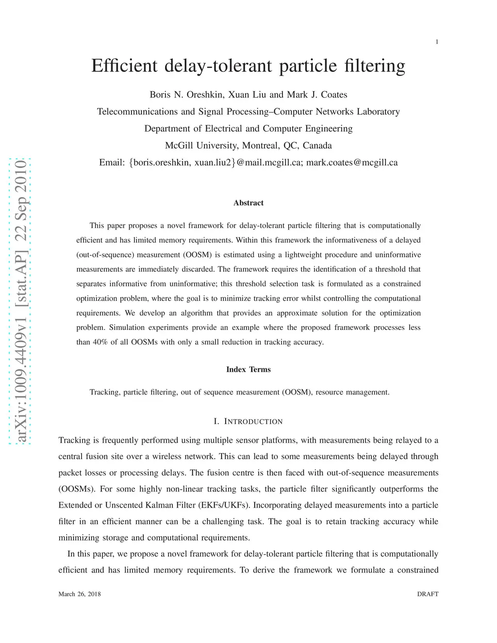 This paper proposes a novel framework for delay-tolerant particle filtering that is computationally efficient and has limited memory requirements. Within this framework the informativeness of a delayed (out-of-sequence) measurement (OOSM) is estimated using a lightweight procedure and uninformative measurements are immediately discarded. The framework requires the identification of a threshold that separates informative from uninformative; this threshold selection task is formulated as a constrained optimization problem, where the goal is to minimize tracking error whilst controlling the computational requirements. We develop an algorithm that provides an approximate solution for the optimization problem. Simulation experiments provide an example where the proposed framework processes less than 40% of all OOSMs with only a small reduction in tracking accuracy.
