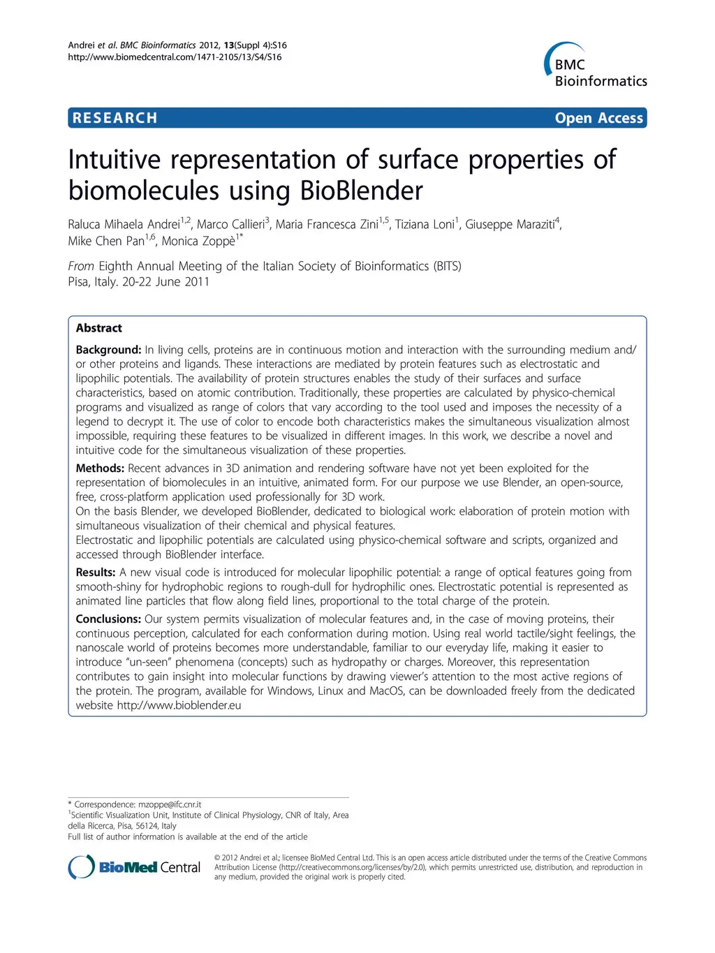 In this and the associated article 'BioBlender: Fast and Efficient All Atom Morphing of Proteins Using Blender Game Engine', by Zini et al., we present BioBlender, a complete instrument for the elaboration of motion (Zini et al.) and the visualization (here) of proteins and other macromolecules, using instruments of computer graphics. The availability of protein structures enables the study of their surfaces and surface properties such as electrostatic potential (EP) and hydropathy (MLP), based on atomic contribution. Recent advances in 3D animation and rendering software have not yet been exploited for the representation of proteins and other biological molecules in an intuitive, animated form. Taking advantage of an open-source, 3D animation and rendering software, Blender, we developed BioBlender, a package dedicated to biological work: elaboration of proteins' motions with the simultaneous visualization of chemical and physical features. EP and MLP are calculated using physico-chemical programs and custom programs and scripts, organized and accessed within BioBlender interface. A new visual code is introduced for MLP visualization: a range of optical features that permits a photorealistic rendering of its spatial distribution on the surface of the protein. EP is represented as animated line particles that flow along field lines proportional to the total charge of the protein. Our system permits EP and MLP visualization of molecules and, in the case of moving proteins, the continuous perception of these features, calculated for each intermediate conformation. Using real world tactile/sight feelings, the nanoscale world of proteins becomes more understandable, familiar to our everyday life, making it easier to introduce "un-seen" phenomena (concepts) such as hydropathy or charges.