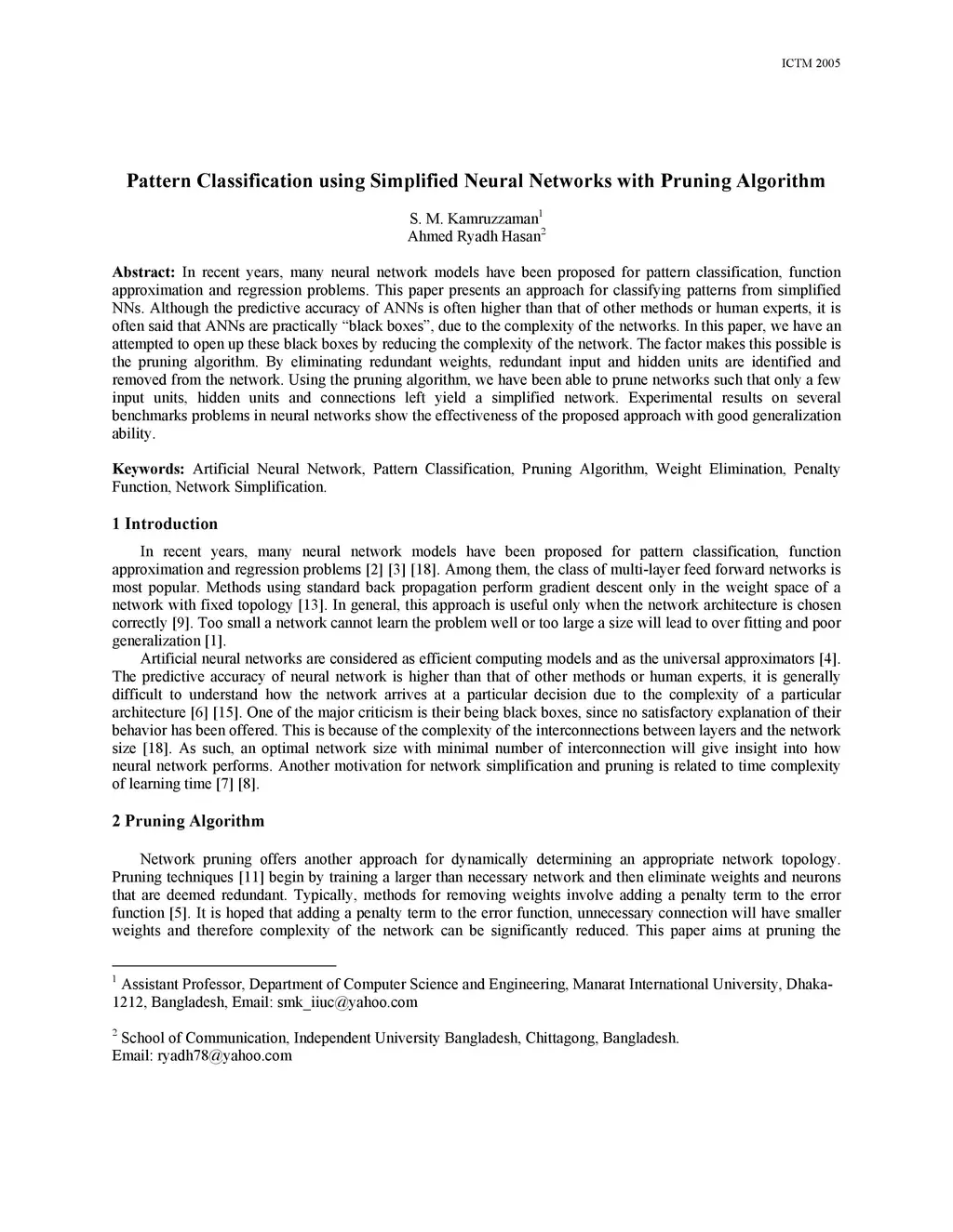 In recent years, many neural network models have been proposed for pattern classification, function approximation and regression problems. This paper presents an approach for classifying patterns from simplified NNs. Although the predictive accuracy of ANNs is often higher than that of other methods or human experts, it is often said that ANNs are practically "black boxes", due to the complexity of the networks. In this paper, we have an attempted to open up these black boxes by reducing the complexity of the network. The factor makes this possible is the pruning algorithm. By eliminating redundant weights, redundant input and hidden units are identified and removed from the network. Using the pruning algorithm, we have been able to prune networks such that only a few input units, hidden units and connections left yield a simplified network. Experimental results on several benchmarks problems in neural networks show the effectiveness of the proposed approach with good generalization ability.