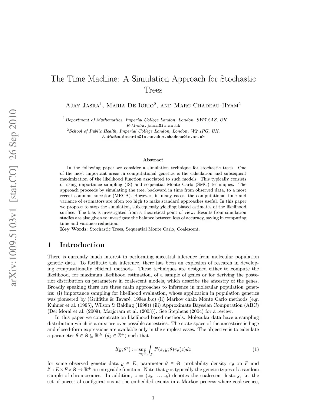 In the following paper we consider a simulation technique for stochastic trees. One of the most important areas in computational genetics is the calculation and subsequent maximization of the likelihood function associated to such models. This typically consists of using importance sampling (IS) and sequential Monte Carlo (SMC) techniques. The approach proceeds by simulating the tree, backward in time from observed data, to a most recent common ancestor (MRCA). However, in many cases, the computational time and variance of estimators are often too high to make standard approaches useful. In this paper we propose to stop the simulation, subsequently yielding biased estimates of the likelihood surface. The bias is investigated from a theoretical point of view. Results from simulation studies are also given to investigate the balance between loss of accuracy, saving in computing time and variance reduction.