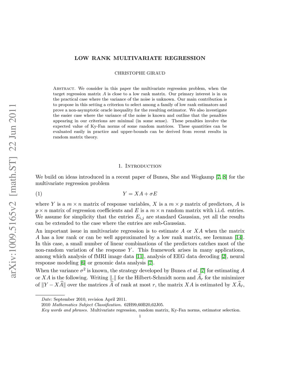 We consider in this paper the multivariate regression problem, when the target regression matrix is close to a low rank matrix. Our primary interest in on the practical case where the variance of the noise is unknown. Our main contribution is to propose in this setting a criterion to select among a family of low rank estimators and prove a non-asymptotic oracle inequality for the resulting estimator. We also investigate the easier case where the variance of the noise is known and outline that the penalties appearing in our criterions are minimal (in some sense). These penalties involve the expected value of the Ky-Fan quasi-norm of some random matrices. These quantities can be evaluated easily in practice and upper-bounds can be derived from recent results in random matrix theory.