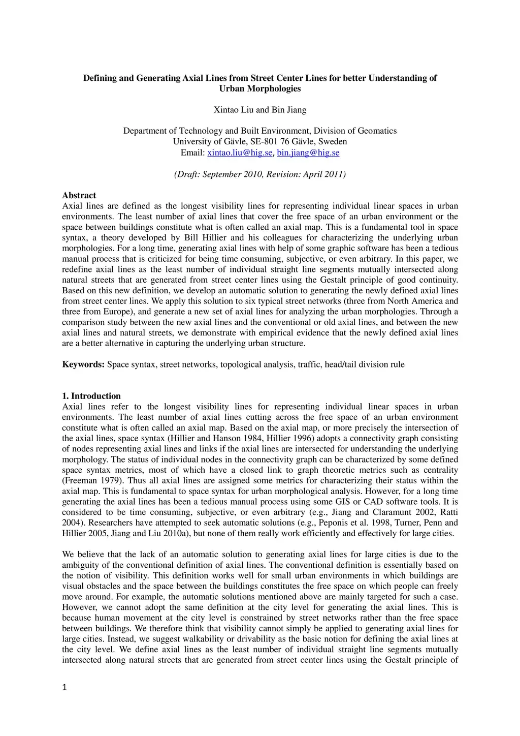 Axial lines are defined as the longest visibility lines for representing individual linear spaces in urban environments. The least number of axial lines that cover the free space of an urban environment or the space between buildings constitute what is often called an axial map. This is a fundamental tool in space syntax, a theory developed by Bill Hillier and his colleagues for characterizing the underlying urban morphologies. For a long time, generating axial lines with help of some graphic software has been a tedious manual process that is criticized for being time consuming, subjective, or even arbitrary. In this paper, we redefine axial lines as the least number of individual straight line segments mutually intersected along natural streets that are generated from street center lines using the Gestalt principle of good continuity. Based on this new definition, we develop an automatic solution to generating the newly defined axial lines from street center lines. We apply this solution to six typical street networks (three from North America and three from Europe), and generate a new set of axial lines for analyzing the urban morphologies. Through a comparison study between the new axial lines and the conventional or old axial lines, and between the new axial lines and natural streets, we demonstrate with empirical evidence that the newly defined axial lines are a better alternative in capturing the underlying urban structure. Keywords: Space syntax, street networks, topological analysis, traffic, head/tail division rule