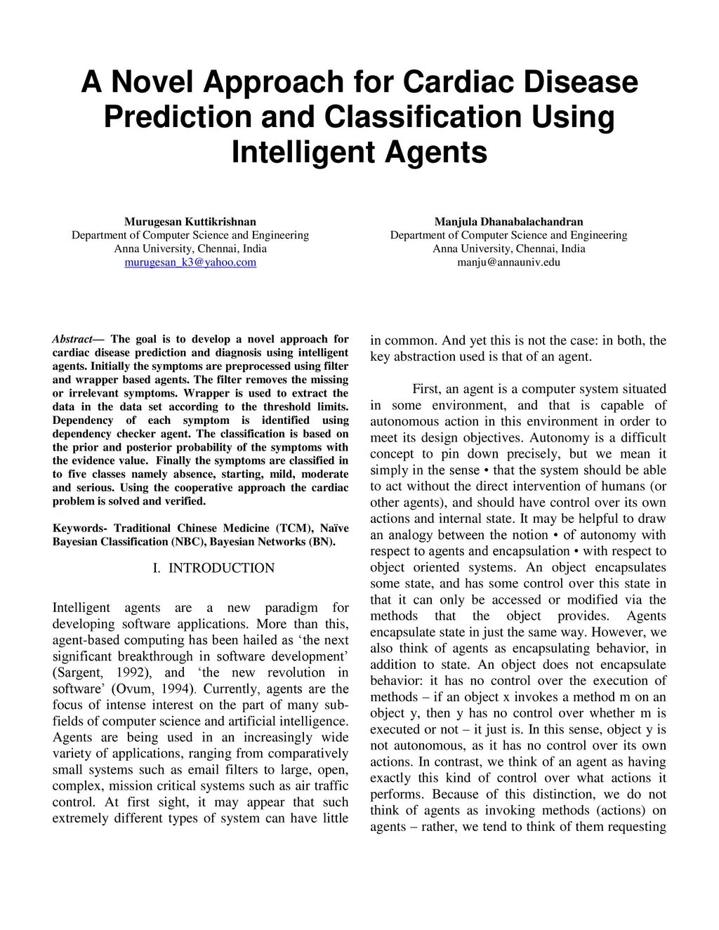 The goal is to develop a novel approach for cardiac disease prediction and diagnosis using intelligent agents. Initially the symptoms are preprocessed using filter and wrapper based agents. The filter removes the missing or irrelevant symptoms. Wrapper is used to extract the data in the data set according to the threshold limits. Dependency of each symptom is identified using dependency checker agent. The classification is based on the prior and posterior probability of the symptoms with the evidence value. Finally the symptoms are classified in to five classes namely absence, starting, mild, moderate and serious. Using the cooperative approach the cardiac problem is solved and verified.