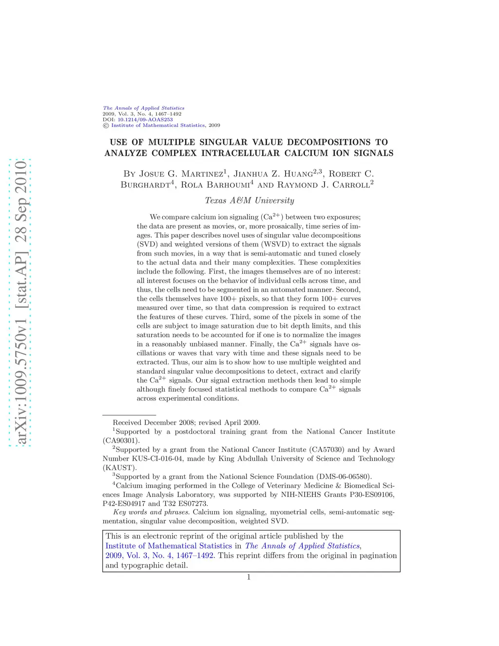 We compare calcium ion signaling () between two exposures; the data are present as movies, or, more prosaically, time series of images. This paper describes novel uses of singular value decompositions (SVD) and weighted versions of them (WSVD) to extract the signals from such movies, in a way that is semi-automatic and tuned closely to the actual data and their many complexities. These complexities include the following. First, the images themselves are of no interest: all interest focuses on the behavior of individual cells across time, and thus, the cells need to be segmented in an automated manner. Second, the cells themselves have 100 pixels, so that they form 100 curves measured over time, so that data compression is required to extract the features of these curves. Third, some of the pixels in some of the cells are subject to image saturation due to bit depth limits, and this saturation needs to be accounted for if one is to normalize the images in a reasonably unbiased manner. Finally, the signals have oscillations or waves that vary with time and these signals need to be extracted. Thus, our aim is to show how to use multiple weighted and standard singular value decompositions to detect, extract and clarify the signals. Our signal extraction methods then lead to simple although finely focused statistical methods to compare signals across experimental conditions.
