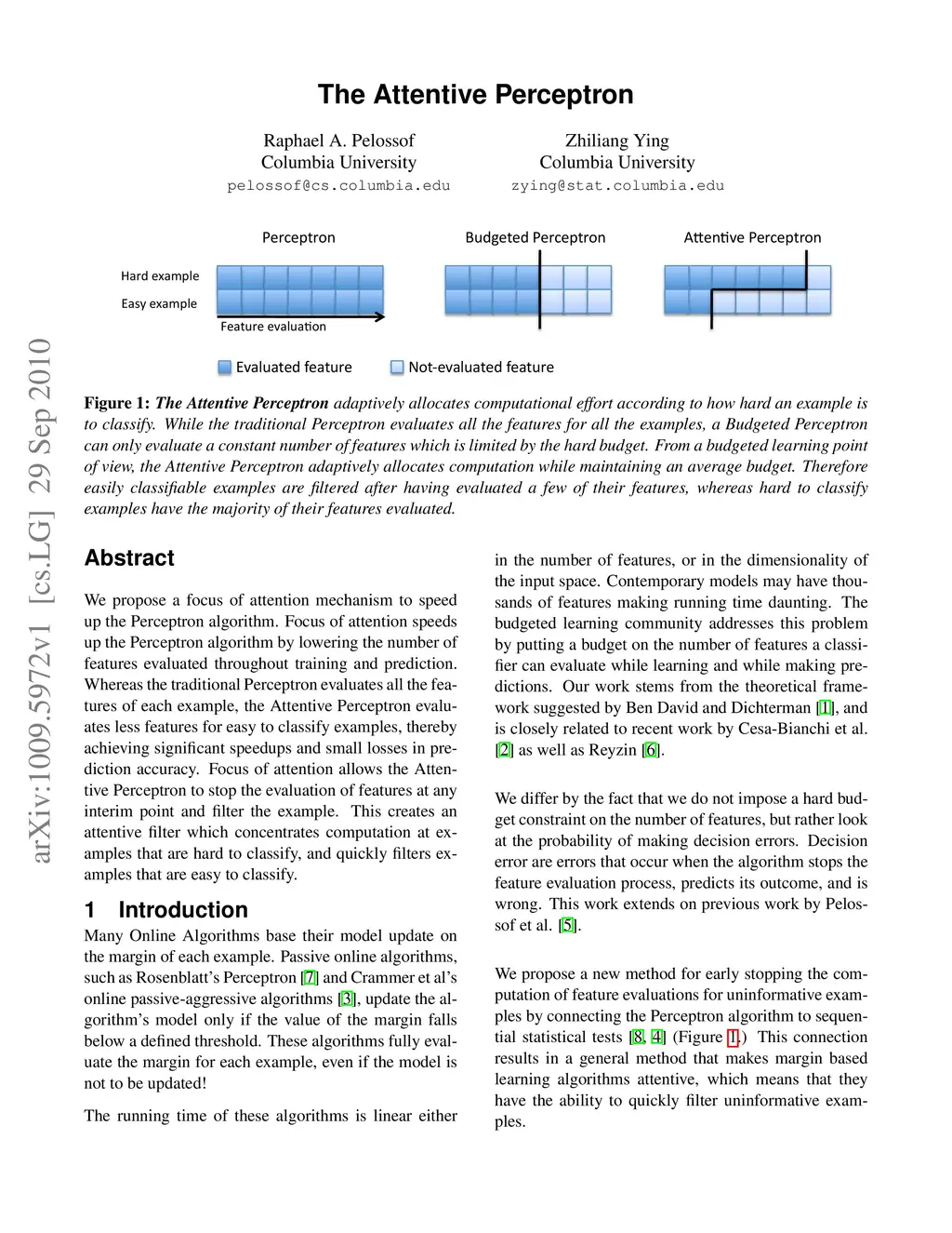 We propose a focus of attention mechanism to speed up the Perceptron algorithm. Focus of attention speeds up the Perceptron algorithm by lowering the number of features evaluated throughout training and prediction. Whereas the traditional Perceptron evaluates all the features of each example, the Attentive Perceptron evaluates less features for easy to classify examples, thereby achieving significant speedups and small losses in prediction accuracy. Focus of attention allows the Attentive Perceptron to stop the evaluation of features at any interim point and filter the example. This creates an attentive filter which concentrates computation at examples that are hard to classify, and quickly filters examples that are easy to classify.