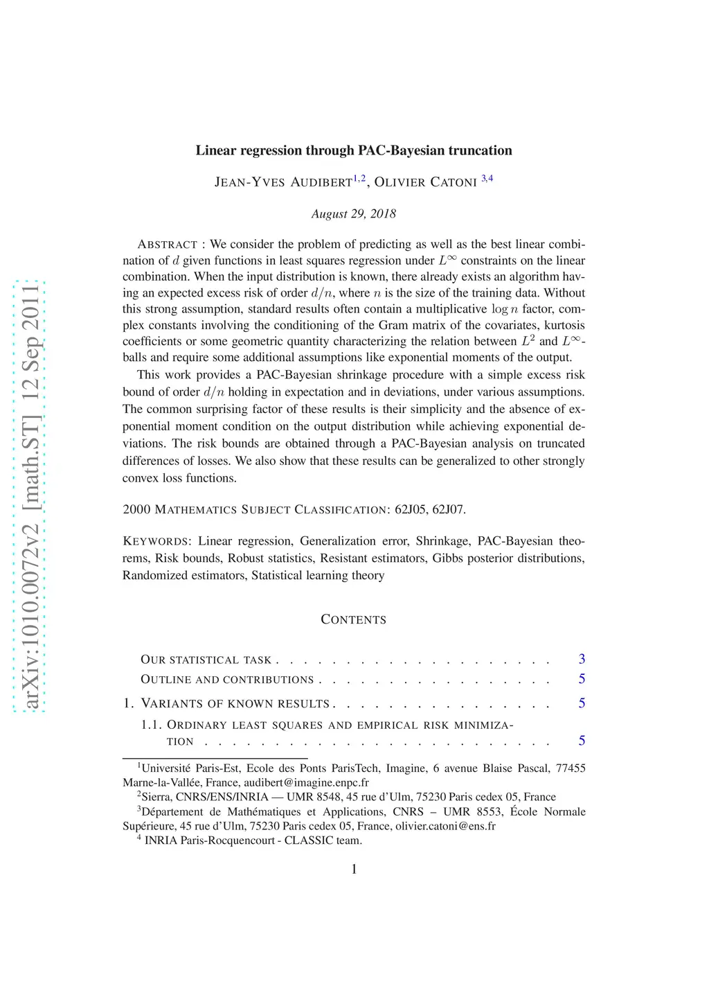 We consider the problem of predicting as well as the best linear combination of d given functions in least squares regression under L^\infty constraints on the linear combination. When the input distribution is known, there already exists an algorithm having an expected excess risk of order d/n, where n is the size of the training data. Without this strong assumption, standard results often contain a multiplicative log(n) factor, complex constants involving the conditioning of the Gram matrix of the covariates, kurtosis coefficients or some geometric quantity characterizing the relation between L^2 and L^\infty-balls and require some additional assumptions like exponential moments of the output. This work provides a PAC-Bayesian shrinkage procedure with a simple excess risk bound of order d/n holding in expectation and in deviations, under various assumptions. The common surprising factor of these results is their simplicity and the absence of exponential moment condition on the output distribution while achieving exponential deviations. The risk bounds are obtained through a PAC-Bayesian analysis on truncated differences of losses. We also show that these results can be generalized to other strongly convex loss functions.