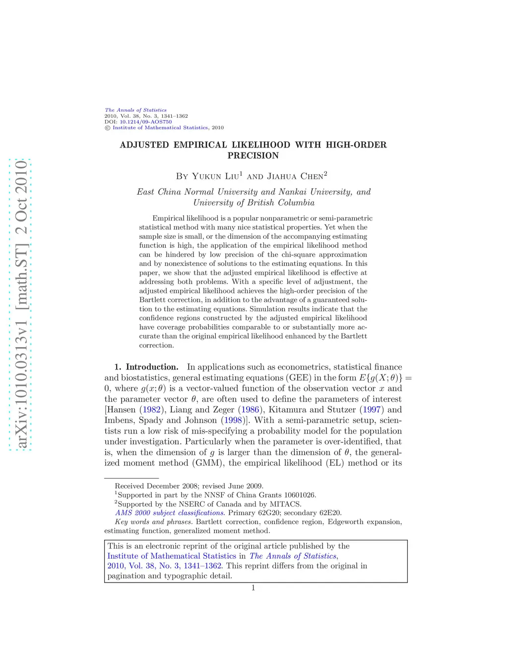 Empirical likelihood is a popular nonparametric or semi-parametric statistical method with many nice statistical properties. Yet when the sample size is small, or the dimension of the accompanying estimating function is high, the application of the empirical likelihood method can be hindered by low precision of the chi-square approximation and by nonexistence of solutions to the estimating equations. In this paper, we show that the adjusted empirical likelihood is effective at addressing both problems. With a specific level of adjustment, the adjusted empirical likelihood achieves the high-order precision of the Bartlett correction, in addition to the advantage of a guaranteed solution to the estimating equations. Simulation results indicate that the confidence regions constructed by the adjusted empirical likelihood have coverage probabilities comparable to or substantially more accurate than the original empirical likelihood enhanced by the Bartlett correction.