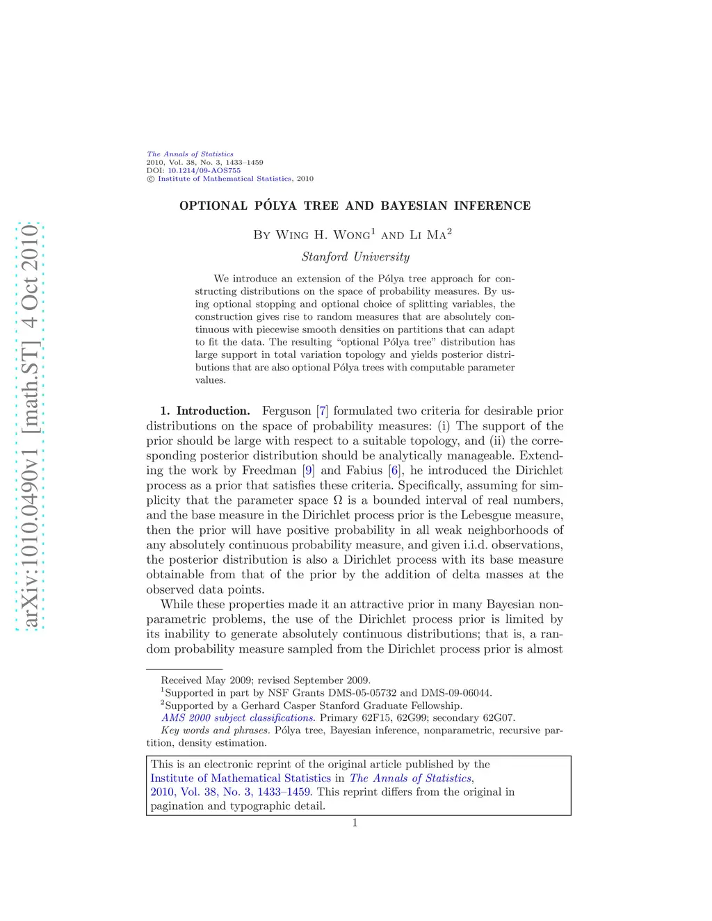 We introduce an extension of the P\ólya tree approach for constructing distributions on the space of probability measures. By using optional stopping and optional choice of splitting variables, the construction gives rise to random measures that are absolutely continuous with piecewise smooth densities on partitions that can adapt to fit the data. The resulting "optional P\'{o}lya tree" distribution has large support in total variation topology and yields posterior distributions that are also optional P\'{o}lya trees with computable parameter values.