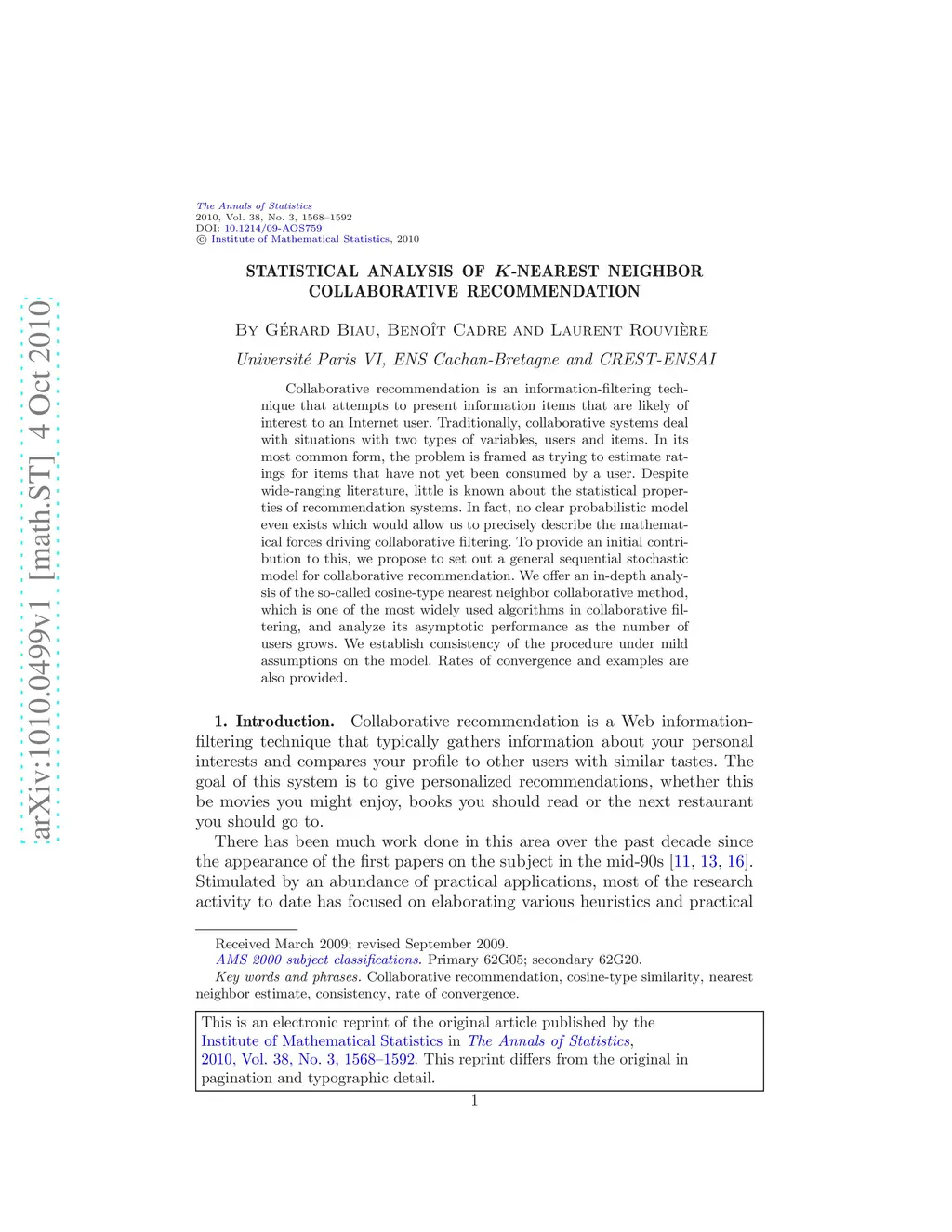 Collaborative recommendation is an information-filtering technique that attempts to present information items that are likely of interest to an Internet user. Traditionally, collaborative systems deal with situations with two types of variables, users and items. In its most common form, the problem is framed as trying to estimate ratings for items that have not yet been consumed by a user. Despite wide-ranging literature, little is known about the statistical properties of recommendation systems. In fact, no clear probabilistic model even exists which would allow us to precisely describe the mathematical forces driving collaborative filtering. To provide an initial contribution to this, we propose to set out a general sequential stochastic model for collaborative recommendation. We offer an in-depth analysis of the so-called cosine-type nearest neighbor collaborative method, which is one of the most widely used algorithms in collaborative filtering, and analyze its asymptotic performance as the number of users grows. We establish consistency of the procedure under mild assumptions on the model. Rates of convergence and examples are also provided.