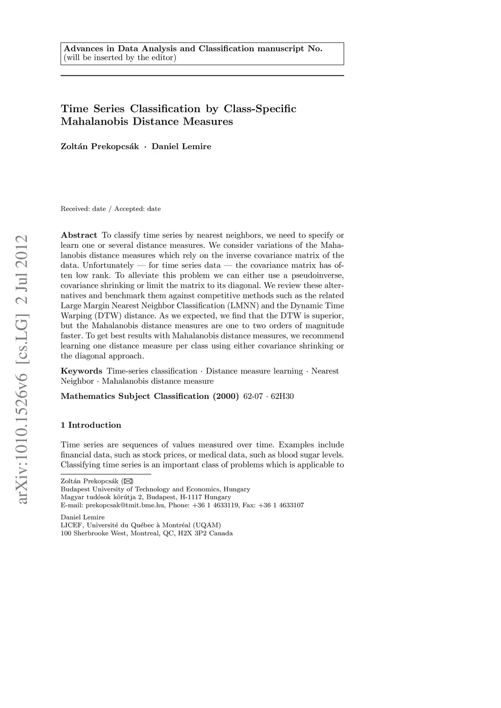 Time Series Classification by Class-Specific Mahalanobis Distance