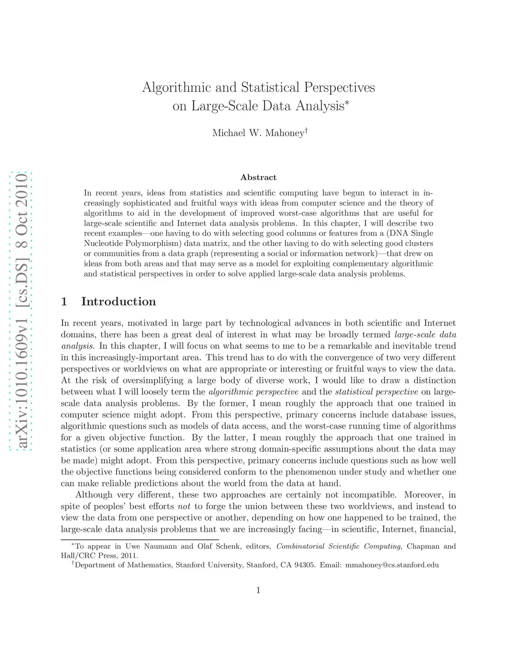 In recent years, ideas from statistics and scientific computing have begun to interact in increasingly sophisticated and fruitful ways with ideas from computer science and the theory of algorithms to aid in the development of improved worst-case algorithms that are useful for large-scale scientific and Internet data analysis problems. In this chapter, I will describe two recent examples---one having to do with selecting good columns or features from a (DNA Single Nucleotide Polymorphism) data matrix, and the other having to do with selecting good clusters or communities from a data graph (representing a social or information network)---that drew on ideas from both areas and that may serve as a model for exploiting complementary algorithmic and statistical perspectives in order to solve applied large-scale data analysis problems.