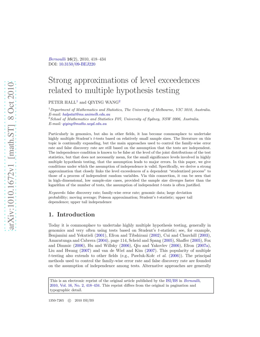Particularly in genomics, but also in other fields, it has become commonplace to undertake highly multiple Student's -tests based on relatively small sample sizes. The literature on this topic is continually expanding, but the main approaches used to control the family-wise error rate and false discovery rate are still based on the assumption that the tests are independent. The independence condition is known to be false at the level of the joint distributions of the test statistics, but that does not necessarily mean, for the small significance levels involved in highly multiple hypothesis testing, that the assumption leads to major errors. In this paper, we give conditions under which the assumption of independence is valid. Specifically, we derive a strong approximation that closely links the level exceedences of a dependent ``studentized process'' to those of a process of independent random variables. Via this connection, it can be seen that in high-dimensional, low sample-size cases, provided the sample size diverges faster than the logarithm of the number of tests, the assumption of independent -tests is often justified.