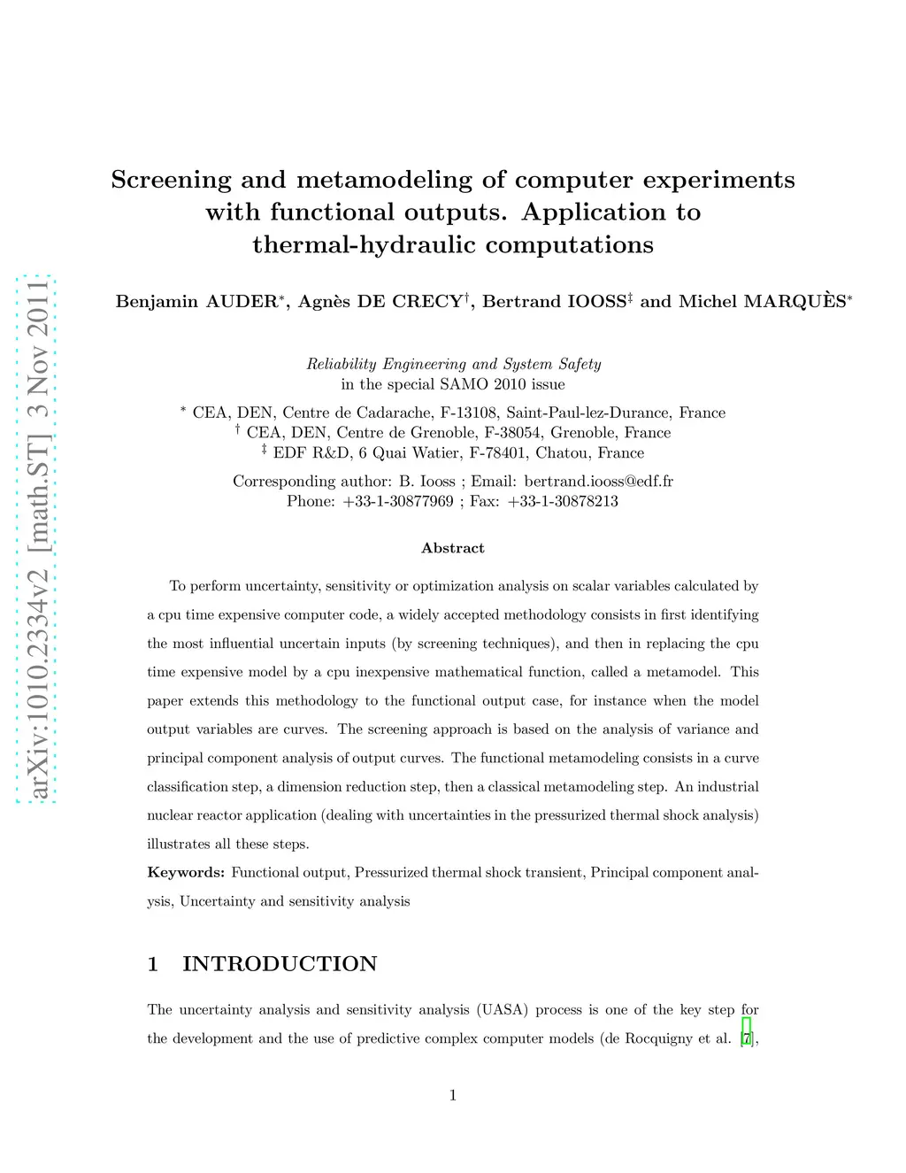 To perform uncertainty, sensitivity or optimization analysis on scalar variables calculated by a cpu time expensive computer code, a widely accepted methodology consists in first identifying the most influential uncertain inputs (by screening techniques), and then in replacing the cpu time expensive model by a cpu inexpensive mathematical function, called a metamodel. This paper extends this methodology to the functional output case, for instance when the model output variables are curves. The screening approach is based on the analysis of variance and principal component analysis of output curves. The functional metamodeling consists in a curve classification step, a dimension reduction step, then a classical metamodeling step. An industrial nuclear reactor application (dealing with uncertainties in the pressurized thermal shock analysis) illustrates all these steps.