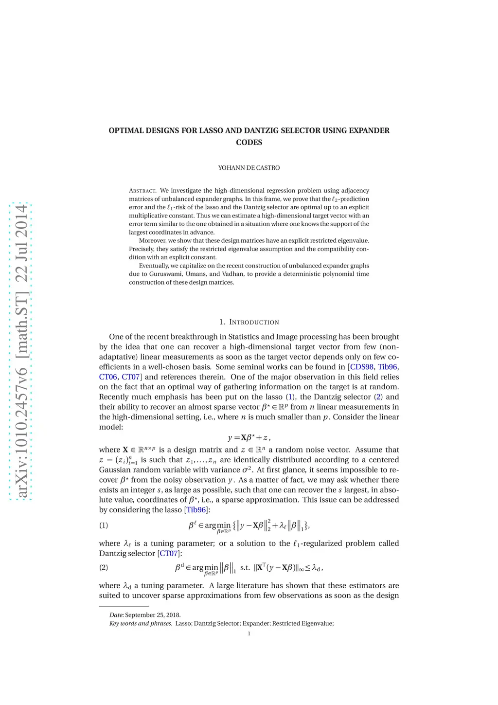 We investigate the high-dimensional regression problem using adjacency matrices of unbalanced expander graphs. In this frame, we prove that the -prediction error and the -risk of the lasso and the Dantzig selector are optimal up to an explicit multiplicative constant. Thus we can estimate a high-dimensional target vector with an error term similar to the one obtained in a situation where one knows the support of the largest coordinates in advance. Moreover, we show that these design matrices have an explicit restricted eigenvalue. Precisely, they satisfy the restricted eigenvalue assumption and the compatibility condition with an explicit constant. Eventually, we capitalize on the recent construction of unbalanced expander graphs due to Guruswami, Umans, and Vadhan, to provide a deterministic polynomial time construction of these design matrices.