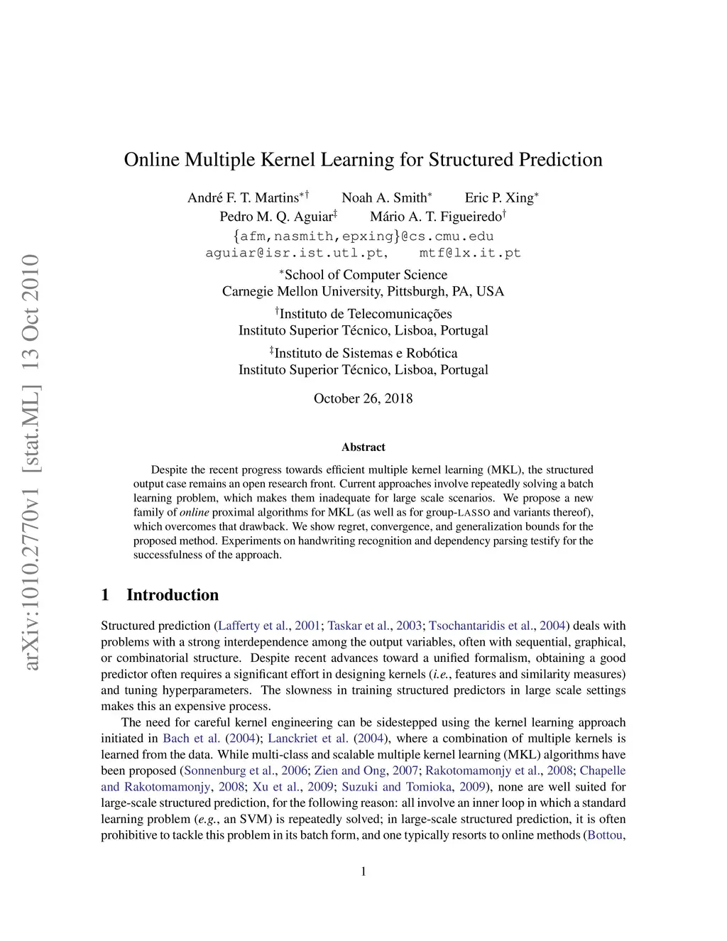 Despite the recent progress towards efficient multiple kernel learning (MKL), the structured output case remains an open research front. Current approaches involve repeatedly solving a batch learning problem, which makes them inadequate for large scale scenarios. We propose a new family of online proximal algorithms for MKL (as well as for group-lasso and variants thereof), which overcomes that drawback. We show regret, convergence, and generalization bounds for the proposed method. Experiments on handwriting recognition and dependency parsing testify for the successfulness of the approach.