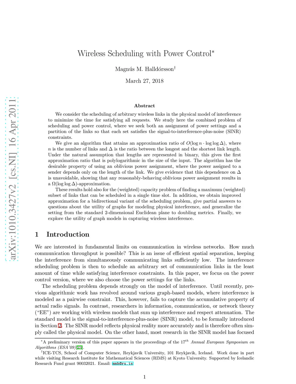 We consider the scheduling of arbitrary wireless links in the physical model of interference to minimize the time for satisfying all requests. We study here the combined problem of scheduling and power control, where we seek both an assignment of power settings and a partition of the links so that each set satisfies the signal-to-interference-plus-noise (SINR) constraints. We give an algorithm that attains an approximation ratio of , where is the number of links and is the ratio between the longest and the shortest link length. Under the natural assumption that lengths are represented in binary, this gives the first approximation ratio that is polylogarithmic in the size of the input. The algorithm has the desirable property of using an oblivious power assignment, where the power assigned to a sender depends only on the length of the link. We give evidence that this dependence on is unavoidable, showing that any reasonably-behaving oblivious power assignment results in a -approximation. These results hold also for the (weighted) capacity problem of finding a maximum (weighted) subset of links that can be scheduled in a single time slot. In addition, we obtain improved approximation for a bidirectional variant of the scheduling problem, give partial answers to questions about the utility of graphs for modeling physical interference, and generalize the setting from the standard 2-dimensional Euclidean plane to doubling metrics. Finally, we explore the utility of graph models in capturing wireless interference.