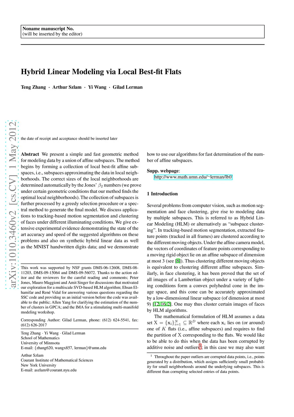 We present a simple and fast geometric method for modeling data by a union of affine subspaces. The method begins by forming a collection of local best-fit affine subspaces, i.e., subspaces approximating the data in local neighborhoods. The correct sizes of the local neighborhoods are determined automatically by the Jones' numbers (we prove under certain geometric conditions that our method finds the optimal local neighborhoods). The collection of subspaces is further processed by a greedy selection procedure or a spectral method to generate the final model. We discuss applications to tracking-based motion segmentation and clustering of faces under different illuminating conditions. We give extensive experimental evidence demonstrating the state of the art accuracy and speed of the suggested algorithms on these problems and also on synthetic hybrid linear data as well as the MNIST handwritten digits data; and we demonstrate how to use our algorithms for fast determination of the number of affine subspaces.