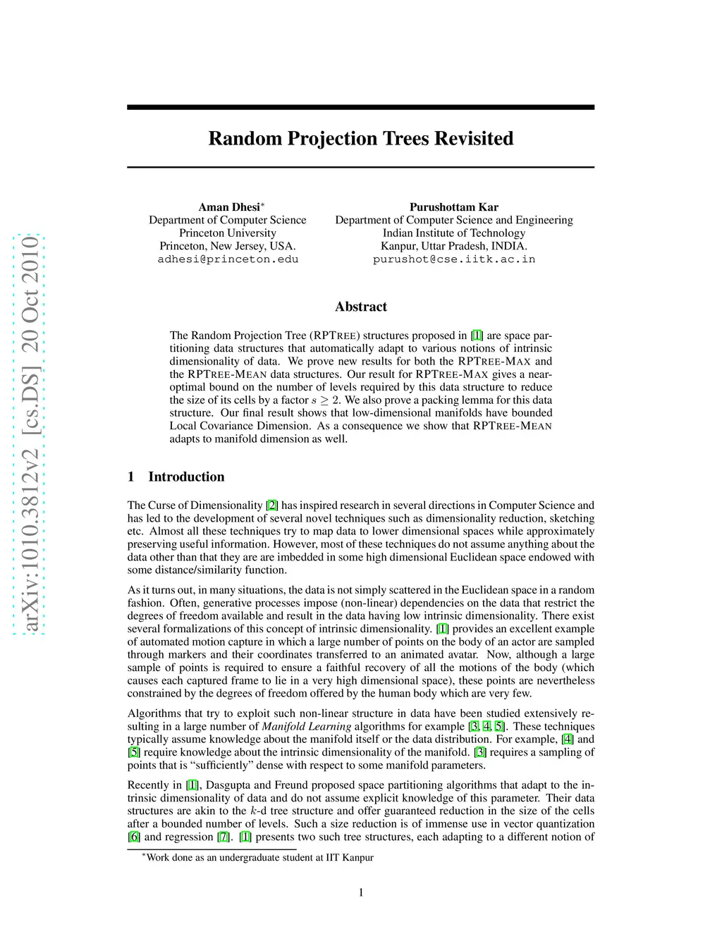The Random Projection Tree structures proposed in [Freund-Dasgupta STOC08] are space partitioning data structures that automatically adapt to various notions of intrinsic dimensionality of data. We prove new results for both the RPTreeMax and the RPTreeMean data structures. Our result for RPTreeMax gives a near-optimal bound on the number of levels required by this data structure to reduce the size of its cells by a factor . We also prove a packing lemma for this data structure. Our final result shows that low-dimensional manifolds have bounded Local Covariance Dimension. As a consequence we show that RPTreeMean adapts to manifold dimension as well.