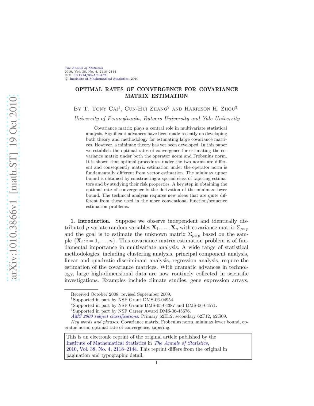 Covariance matrix plays a central role in multivariate statistical analysis. Significant advances have been made recently on developing both theory and methodology for estimating large covariance matrices. However, a minimax theory has yet been developed. In this paper we establish the optimal rates of convergence for estimating the covariance matrix under both the operator norm and Frobenius norm. It is shown that optimal procedures under the two norms are different and consequently matrix estimation under the operator norm is fundamentally different from vector estimation. The minimax upper bound is obtained by constructing a special class of tapering estimators and by studying their risk properties. A key step in obtaining the optimal rate of convergence is the derivation of the minimax lower bound. The technical analysis requires new ideas that are quite different from those used in the more conventional function/sequence estimation problems.