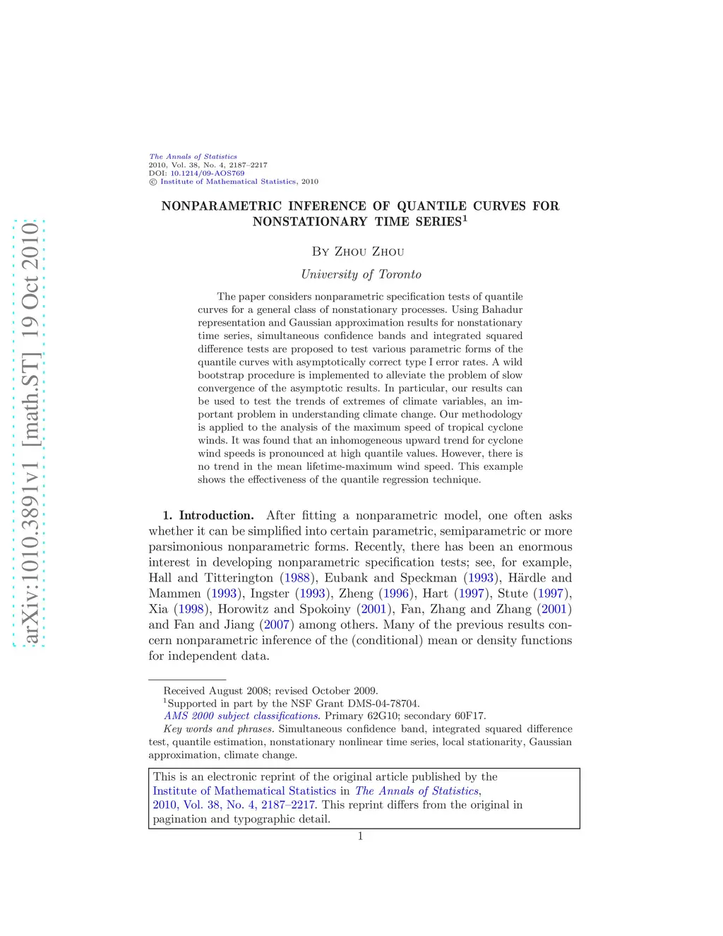The paper considers nonparametric specification tests of quantile curves for a general class of nonstationary processes. Using Bahadur representation and Gaussian approximation results for nonstationary time series, simultaneous confidence bands and integrated squared difference tests are proposed to test various parametric forms of the quantile curves with asymptotically correct type I error rates. A wild bootstrap procedure is implemented to alleviate the problem of slow convergence of the asymptotic results. In particular, our results can be used to test the trends of extremes of climate variables, an important problem in understanding climate change. Our methodology is applied to the analysis of the maximum speed of tropical cyclone winds. It was found that an inhomogeneous upward trend for cyclone wind speeds is pronounced at high quantile values. However, there is no trend in the mean lifetime-maximum wind speed. This example shows the effectiveness of the quantile regression technique.