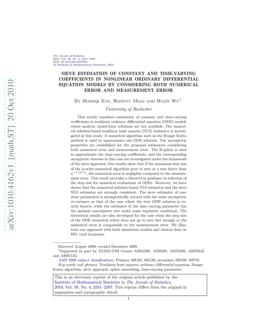 This article considers estimation of constant and time-varying coefficients in nonlinear ordinary differential equation (ODE) models where analytic closed-form solutions are not available. The numerical solution-based nonlinear least squares (NLS) estimator is investigated in this study. A numerical algorithm such as the Runge--Kutta method is used to approximate the ODE solution. The asymptotic properties are established for the proposed estimators considering both numerical error and measurement error. The B-spline is used to approximate the time-varying coefficients, and the corresponding asymptotic theories in this case are investigated under the framework of the sieve approach. Our results show that if the maximum step size of the -order numerical algorithm goes to zero at a rate faster than , the numerical error is negligible compared to the measurement error. This result provides a theoretical guidance in selection of the step size for numerical evaluations of ODEs. Moreover, we have shown that the numerical solution-based NLS estimator and the sieve NLS estimator are strongly consistent. The sieve estimator of constant parameters is asymptotically normal with the same asymptotic co-variance as that of the case where the true ODE solution is exactly known, while the estimator of the time-varying parameter has the optimal convergence rate under some regularity conditions. The theoretical results are also developed for the case when the step size of the ODE numerical solver does not go to zero fast enough or the numerical error is comparable to the measurement error. We illustrate our approach with both simulation studies and clinical data on HIV viral dynamics.