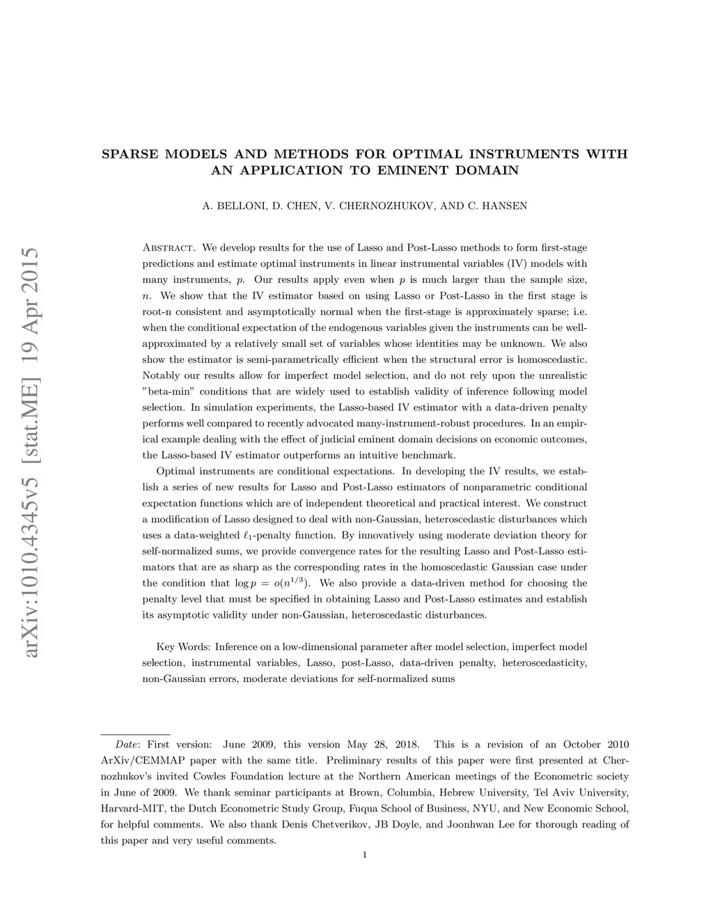 We develop results for the use of Lasso and Post-Lasso methods to form first-stage predictions and estimate optimal instruments in linear instrumental variables (IV) models with many instruments, . Our results apply even when is much larger than the sample size, . We show that the IV estimator based on using Lasso or Post-Lasso in the first stage is root-n consistent and asymptotically normal when the first-stage is approximately sparse; i.e. when the conditional expectation of the endogenous variables given the instruments can be well-approximated by a relatively small set of variables whose identities may be unknown. We also show the estimator is semi-parametrically efficient when the structural error is homoscedastic. Notably our results allow for imperfect model selection, and do not rely upon the unrealistic "beta-min" conditions that are widely used to establish validity of inference following model selection. In simulation experiments, the Lasso-based IV estimator with a data-driven penalty performs well compared to recently advocated many-instrument-robust procedures. In an empirical example dealing with the effect of judicial eminent domain decisions on economic outcomes, the Lasso-based IV estimator outperforms an intuitive benchmark. In developing the IV results, we establish a series of new results for Lasso and Post-Lasso estimators of nonparametric conditional expectation functions which are of independent theoretical and practical interest. We construct a modification of Lasso designed to deal with non-Gaussian, heteroscedastic disturbances which uses a data-weighted -penalty function. Using moderate deviation theory for self-normalized sums, we provide convergence rates for the resulting Lasso and Post-Lasso estimators that are as sharp as the corresponding rates in the homoscedastic Gaussian case under the condition that .