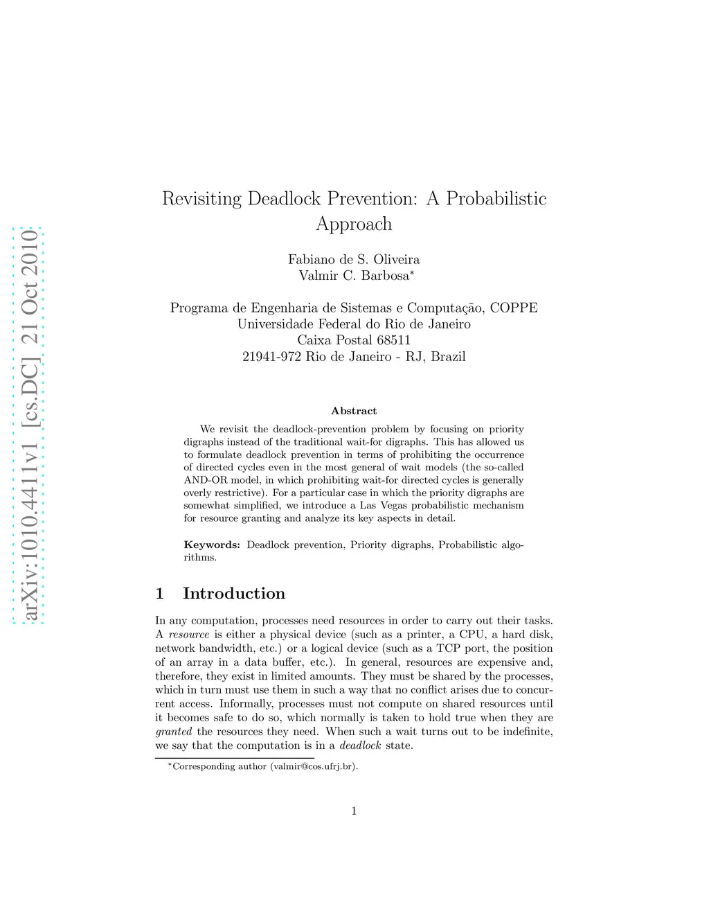 We revisit the deadlock-prevention problem by focusing on priority digraphs instead of the traditional wait-for digraphs. This has allowed us to formulate deadlock prevention in terms of prohibiting the occurrence of directed cycles even in the most general of wait models (the so-called AND-OR model, in which prohibiting wait-for directed cycles is generally overly restrictive). For a particular case in which the priority digraphs are somewhat simplified, we introduce a Las Vegas probabilistic mechanism for resource granting and analyze its key aspects in detail.