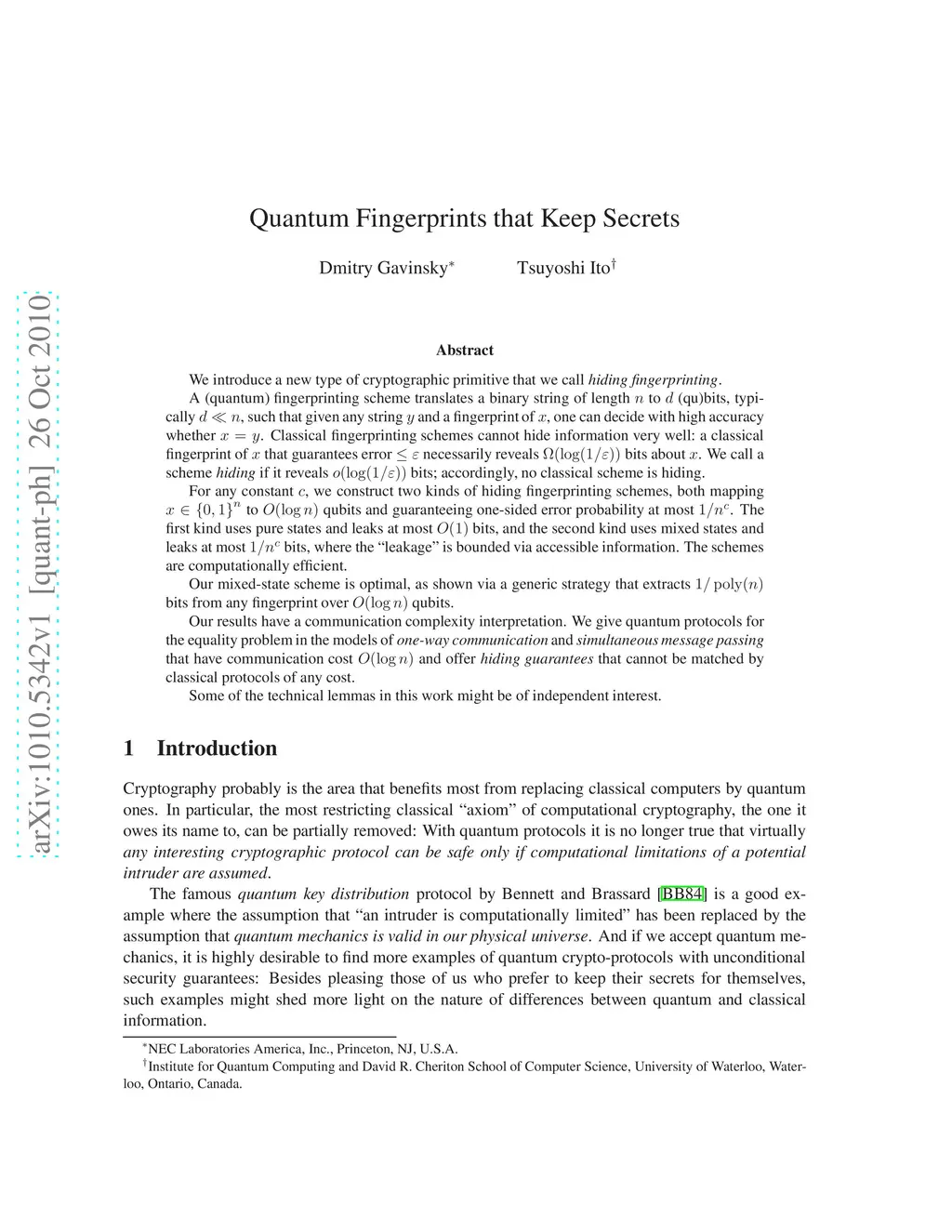 We introduce a new type of cryptographic primitive that we call hiding fingerprinting. A (quantum) fingerprinting scheme translates a binary string of length to (qu)bits, typically , such that given any string and a fingerprint of , one can decide with high accuracy whether . Classical fingerprinting schemes cannot hide information very well: a classical fingerprint of that guarantees error at most necessarily reveals bits about . We call a scheme hiding if it reveals bits; accordingly, no classical scheme is hiding. For any constant , we construct two kinds of hiding fingerprinting schemes, both mapping -bit strings to qubits and guaranteeing one-sided error probability at most . The first kind uses pure states and leaks at most O(1) bits, and the second kind uses mixed states and leaks at most bits, where the "leakage" is bounded via accessible information. The schemes are computationally efficient. Our mixed-state scheme is optimal, as shown via a generic strategy that extracts bits from any fingerprint over qubits.