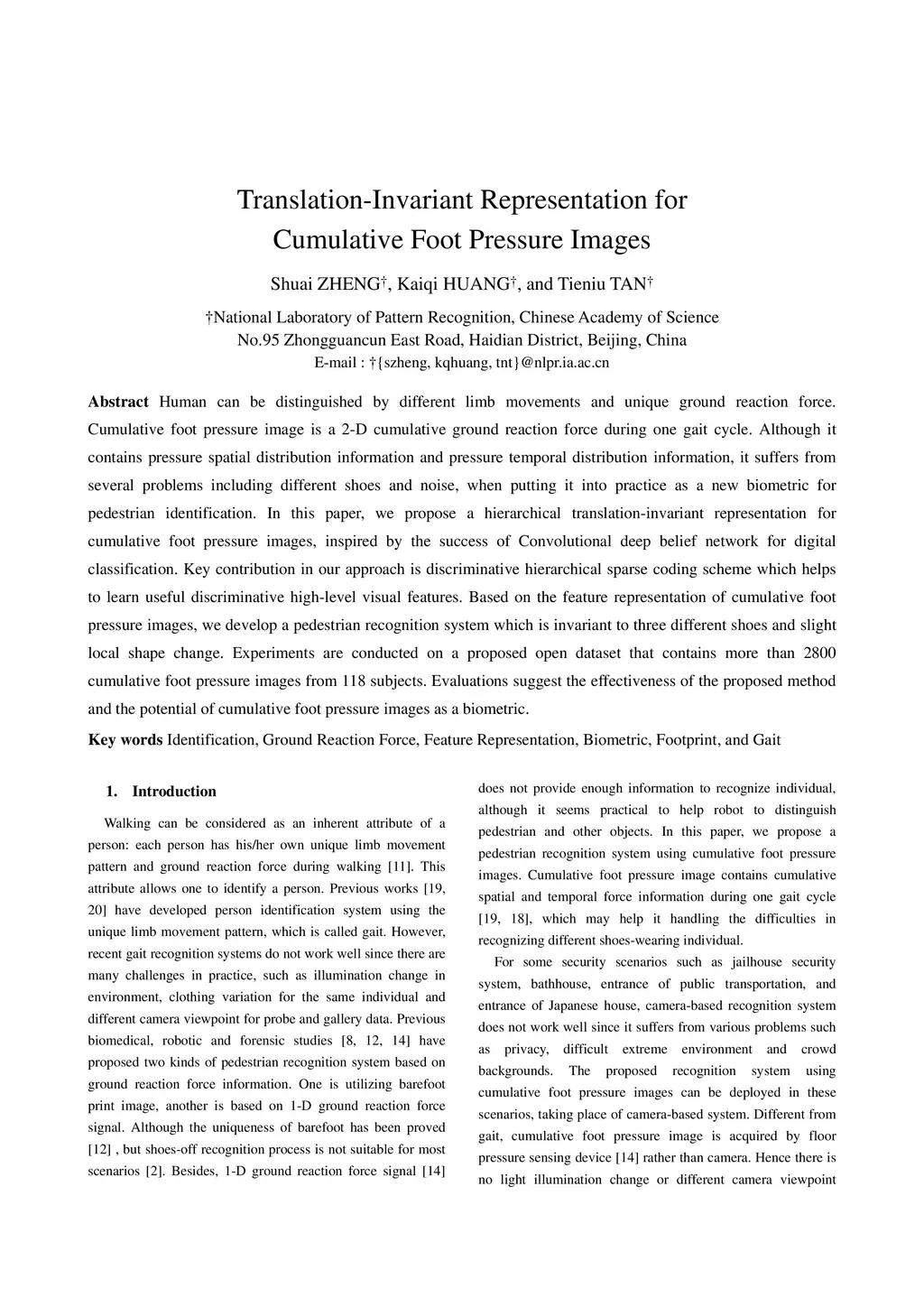 Human can be distinguished by different limb movements and unique ground reaction force. Cumulative foot pressure image is a 2-D cumulative ground reaction force during one gait cycle. Although it contains pressure spatial distribution information and pressure temporal distribution information, it suffers from several problems including different shoes and noise, when putting it into practice as a new biometric for pedestrian identification. In this paper, we propose a hierarchical translation-invariant representation for cumulative foot pressure images, inspired by the success of Convolutional deep belief network for digital classification. Key contribution in our approach is discriminative hierarchical sparse coding scheme which helps to learn useful discriminative high-level visual features. Based on the feature representation of cumulative foot pressure images, we develop a pedestrian recognition system which is invariant to three different shoes and slight local shape change. Experiments are conducted on a proposed open dataset that contains more than 2800 cumulative foot pressure images from 118 subjects. Evaluations suggest the effectiveness of the proposed method and the potential of cumulative foot pressure images as a biometric.