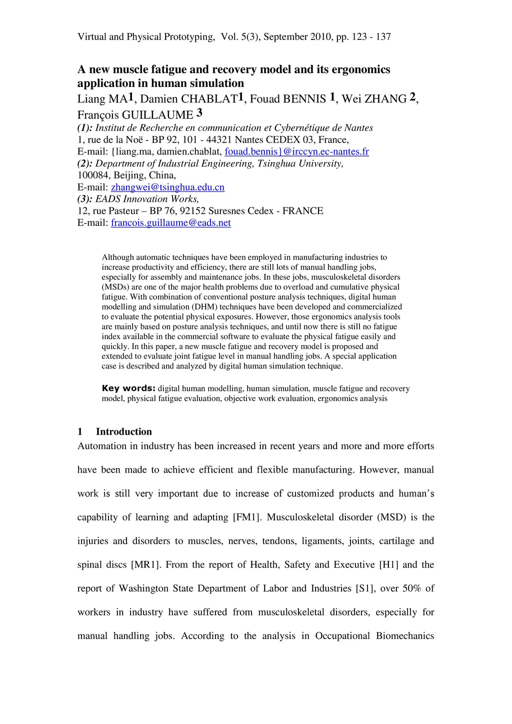 Although automatic techniques have been employed in manufacturing industries to increase productivity and efficiency, there are still lots of manual handling jobs, especially for assembly and maintenance jobs. In these jobs, musculoskeletal disorders (MSDs) are one of the major health problems due to overload and cumulative physical fatigue. With combination of conventional posture analysis techniques, digital human modelling and simulation (DHM) techniques have been developed and commercialized to evaluate the potential physical exposures. However, those ergonomics analysis tools are mainly based on posture analysis techniques, and until now there is still no fatigue index available in the commercial software to evaluate the physical fatigue easily and quickly. In this paper, a new muscle fatigue and recovery model is proposed and extended to evaluate joint fatigue level in manual handling jobs. A special application case is described and analyzed by digital human simulation technique.