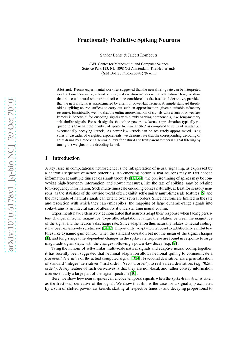 Recent experimental work has suggested that the neural firing rate can be interpreted as a fractional derivative, at least when signal variation induces neural adaptation. Here, we show that the actual neural spike-train itself can be considered as the fractional derivative, provided that the neural signal is approximated by a sum of power-law kernels. A simple standard thresholding spiking neuron suffices to carry out such an approximation, given a suitable refractory response. Empirically, we find that the online approximation of signals with a sum of power-law kernels is beneficial for encoding signals with slowly varying components, like long-memory self-similar signals. For such signals, the online power-law kernel approximation typically required less than half the number of spikes for similar SNR as compared to sums of similar but exponentially decaying kernels. As power-law kernels can be accurately approximated using sums or cascades of weighted exponentials, we demonstrate that the corresponding decoding of spike-trains by a receiving neuron allows for natural and transparent temporal signal filtering by tuning the weights of the decoding kernel.