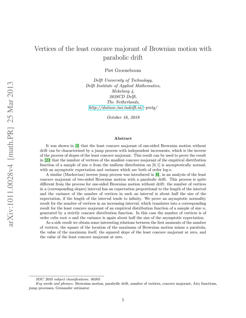 It was shown in Groeneboom (1983) that the least concave majorant of one-sided Brownian motion without drift can be characterized by a jump process with independent increments, which is the inverse of the process of slopes of the least concave majorant. This result can be used to prove the result of Sparre Andersen (1954) that the number of vertices of the smallest concave majorant of the empirical distribution function of a sample of size n from the uniform distribution on [0,1] is asymptotically normal, with an asymptotic expectation and variance which are both of order log n. A similar (Markovian) inverse jump process was introduced in Groeneboom (1989), in an analysis of the least concave majorant of two-sided Brownian motion with a parabolic drift. This process is quite different from the process for one-sided Brownian motion without drift: the number of vertices in a (corresponding slopes) interval has an expectation proportional to the length of the interval and the variance of the number of vertices in such an interval is about half the size of the expectation, if the length of the interval tends to infinity. We prove an asymptotic normality result for the number of vertices in an increasing interval, which translates into a corresponding result for the least concave majorant of an empirical distribution function of a sample of size n, generated by a strictly concave distribution function. In this case the number of vertices is of order cube root n, and the variance is again about half the size of the asymptotic expectation. As a side result we obtain some interesting relations between the first moments of the number of vertices, the square of the location of the maximum of Brownian motion minus a parabola, the value of the maximum itself, the squared slope of the least concave majorant at zero, and the value of the least concave majorant at zero.