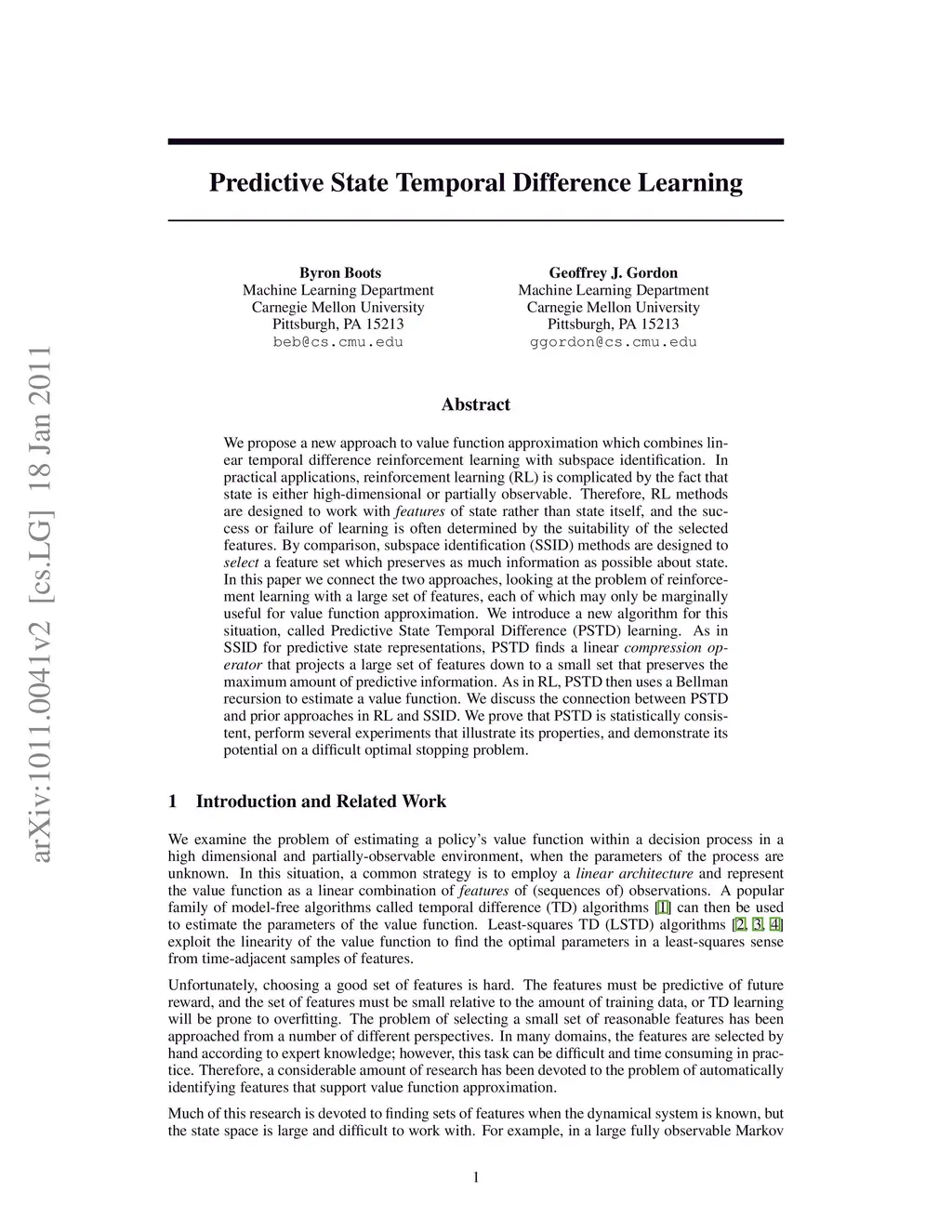 We propose a new approach to value function approximation which combines linear temporal difference reinforcement learning with subspace identification. In practical applications, reinforcement learning (RL) is complicated by the fact that state is either high-dimensional or partially observable. Therefore, RL methods are designed to work with features of state rather than state itself, and the success or failure of learning is often determined by the suitability of the selected features. By comparison, subspace identification (SSID) methods are designed to select a feature set which preserves as much information as possible about state. In this paper we connect the two approaches, looking at the problem of reinforcement learning with a large set of features, each of which may only be marginally useful for value function approximation. We introduce a new algorithm for this situation, called Predictive State Temporal Difference (PSTD) learning. As in SSID for predictive state representations, PSTD finds a linear compression operator that projects a large set of features down to a small set that preserves the maximum amount of predictive information. As in RL, PSTD then uses a Bellman recursion to estimate a value function. We discuss the connection between PSTD and prior approaches in RL and SSID. We prove that PSTD is statistically consistent, perform several experiments that illustrate its properties, and demonstrate its potential on a difficult optimal stopping problem.