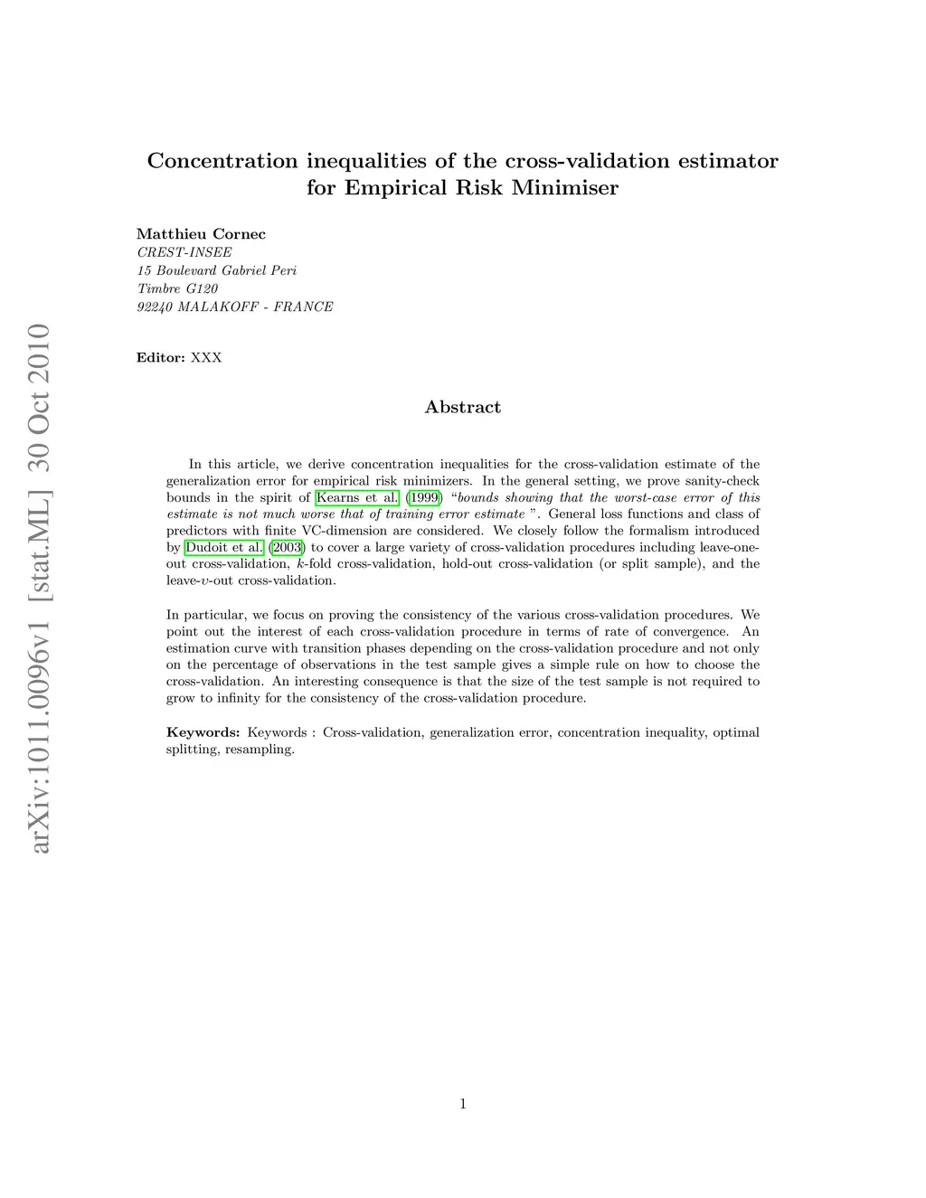 In this article, we derive concentration inequalities for the cross-validation estimate of the generalization error for empirical risk minimizers. In the general setting, we prove sanity-check bounds in the spirit of \cite{KR99} \textquotedblleft\textit{bounds showing that the worst-case error of this estimate is not much worse that of training error estimate} \textquotedblright . General loss functions and class of predictors with finite VC-dimension are considered. We closely follow the formalism introduced by \cite{DUD03} to cover a large variety of cross-validation procedures including leave-one-out cross-validation, % -fold cross-validation, hold-out cross-validation (or split sample), and the leave--out cross-validation. In particular, we focus on proving the consistency of the various cross-validation procedures. We point out the interest of each cross-validation procedure in terms of rate of convergence. An estimation curve with transition phases depending on the cross-validation procedure and not only on the percentage of observations in the test sample gives a simple rule on how to choose the cross-validation. An interesting consequence is that the size of the test sample is not required to grow to infinity for the consistency of the cross-validation procedure.
