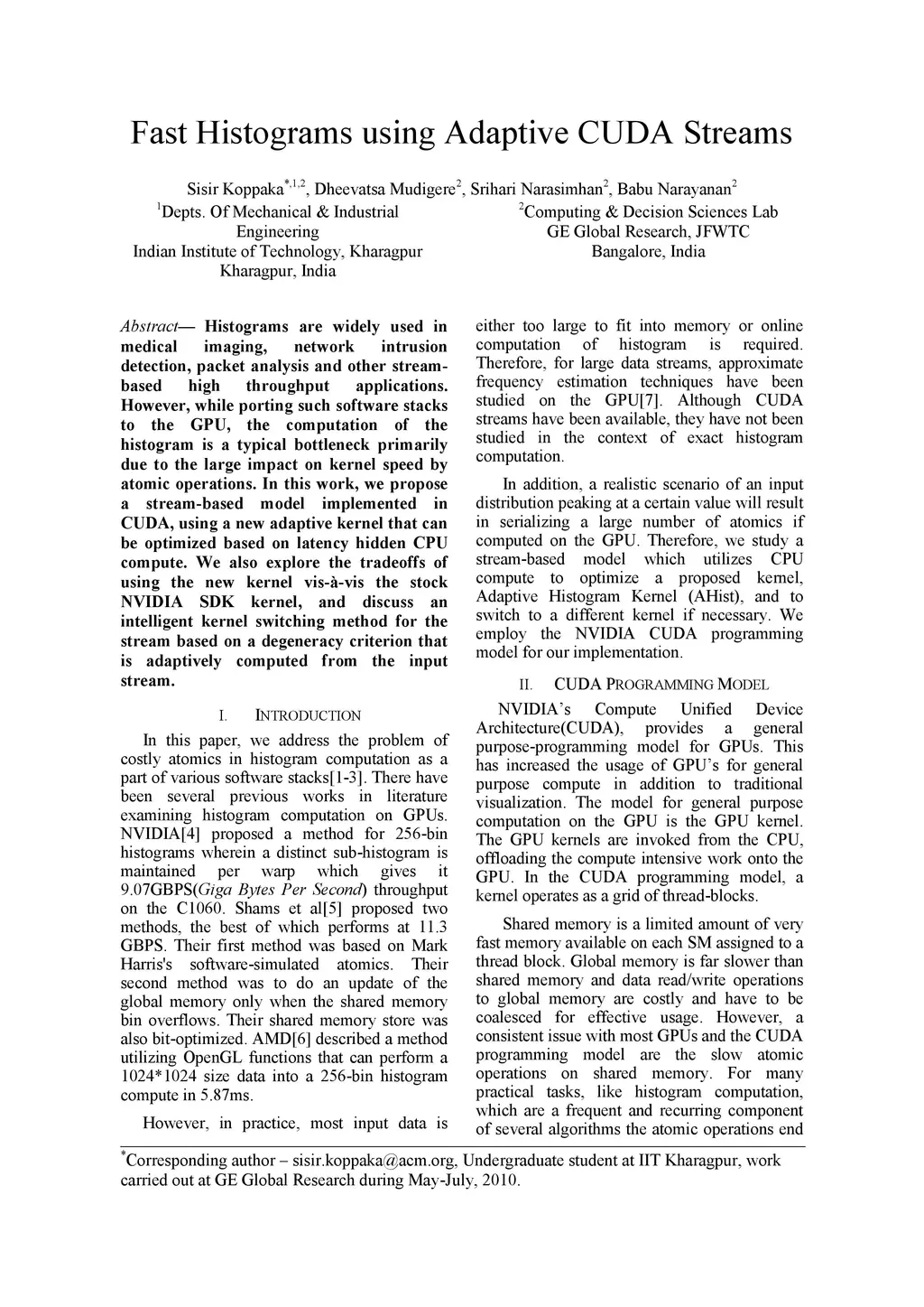 Histograms are widely used in medical imaging, network intrusion detection, packet analysis and other stream-based high throughput applications. However, while porting such software stacks to the GPU, the computation of the histogram is a typical bottleneck primarily due to the large impact on kernel speed by atomic operations. In this work, we propose a stream-based model implemented in CUDA, using a new adaptive kernel that can be optimized based on latency hidden CPU compute. We also explore the tradeoffs of using the new kernel vis-\`a-vis the stock NVIDIA SDK kernel, and discuss an intelligent kernel switching method for the stream based on a degeneracy criterion that is adaptively computed from the input stream.