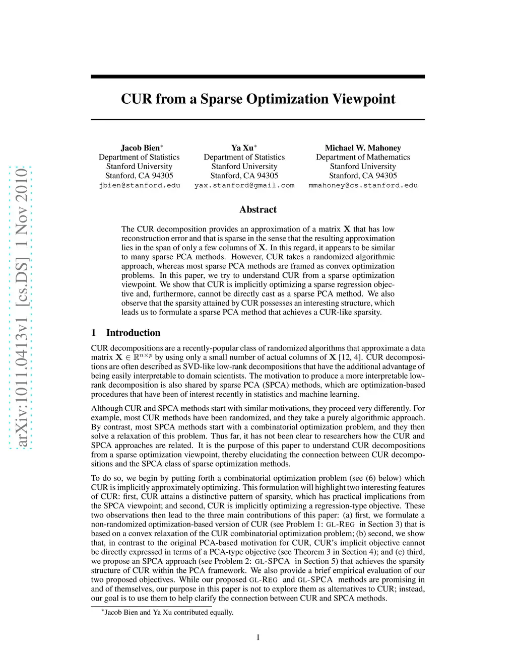 The CUR decomposition provides an approximation of a matrix that has low reconstruction error and that is sparse in the sense that the resulting approximation lies in the span of only a few columns of . In this regard, it appears to be similar to many sparse PCA methods. However, CUR takes a randomized algorithmic approach, whereas most sparse PCA methods are framed as convex optimization problems. In this paper, we try to understand CUR from a sparse optimization viewpoint. We show that CUR is implicitly optimizing a sparse regression objective and, furthermore, cannot be directly cast as a sparse PCA method. We also observe that the sparsity attained by CUR possesses an interesting structure, which leads us to formulate a sparse PCA method that achieves a CUR-like sparsity.