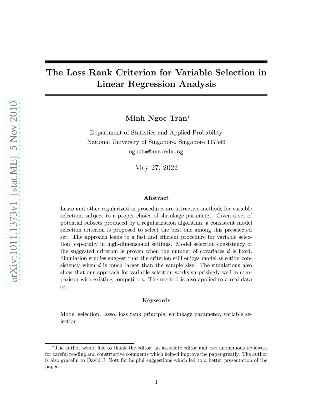 The Loss Rank Criterion for Variable Selection in Linear Regression