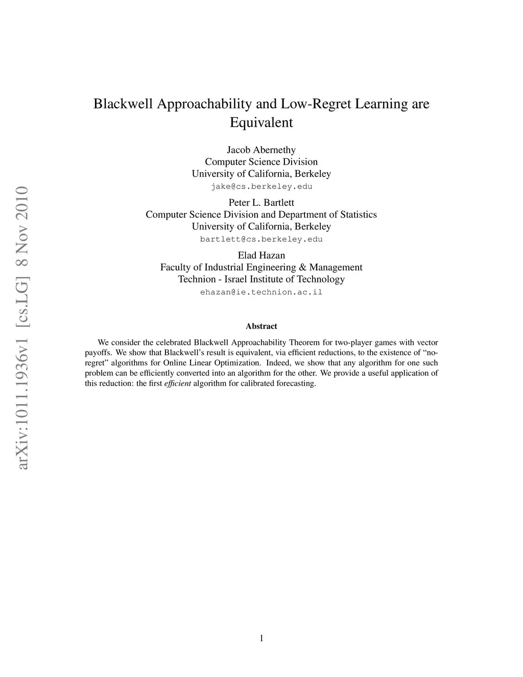 We consider the celebrated Blackwell Approachability Theorem for two-player games with vector payoffs. We show that Blackwell's result is equivalent, via efficient reductions, to the existence of "no-regret" algorithms for Online Linear Optimization. Indeed, we show that any algorithm for one such problem can be efficiently converted into an algorithm for the other. We provide a useful application of this reduction: the first efficient algorithm for calibrated forecasting.