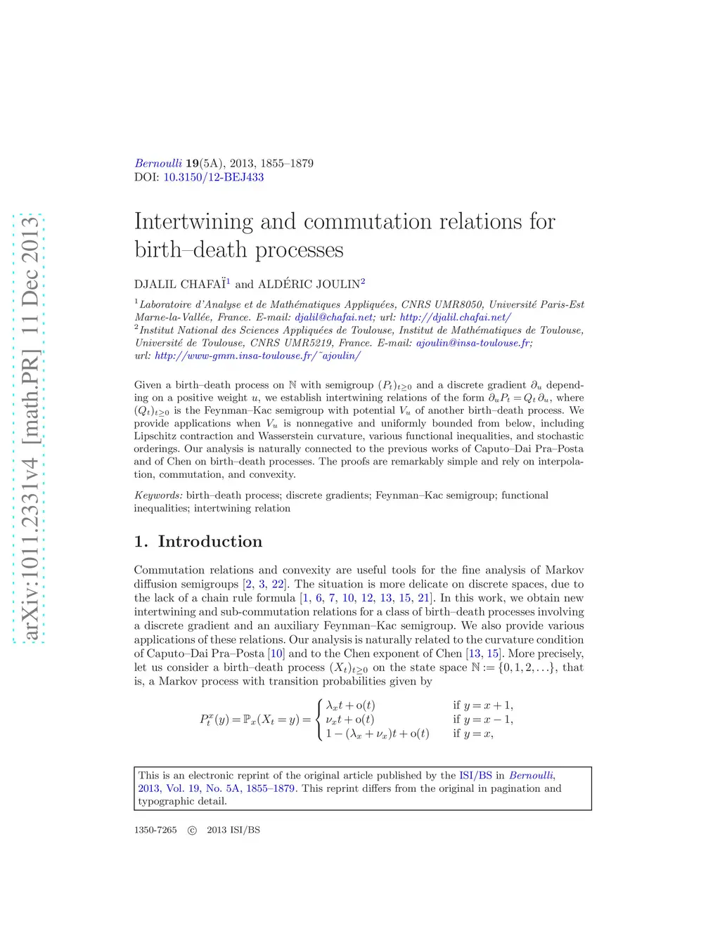 Given a birth-death process on with semigroup and a discrete gradient depending on a positive weight , we establish intertwining relations of the form , where is the Feynman-Kac semigroup with potential of another birth-death process. We provide applications when is nonnegative and uniformly bounded from below, including Lipschitz contraction and Wasserstein curvature, various functional inequalities, and stochastic orderings. Our analysis is naturally connected to the previous works of Caputo-Dai Pra-Posta and of Chen on birth-death processes. The proofs are remarkably simple and rely on interpolation, commutation, and convexity.