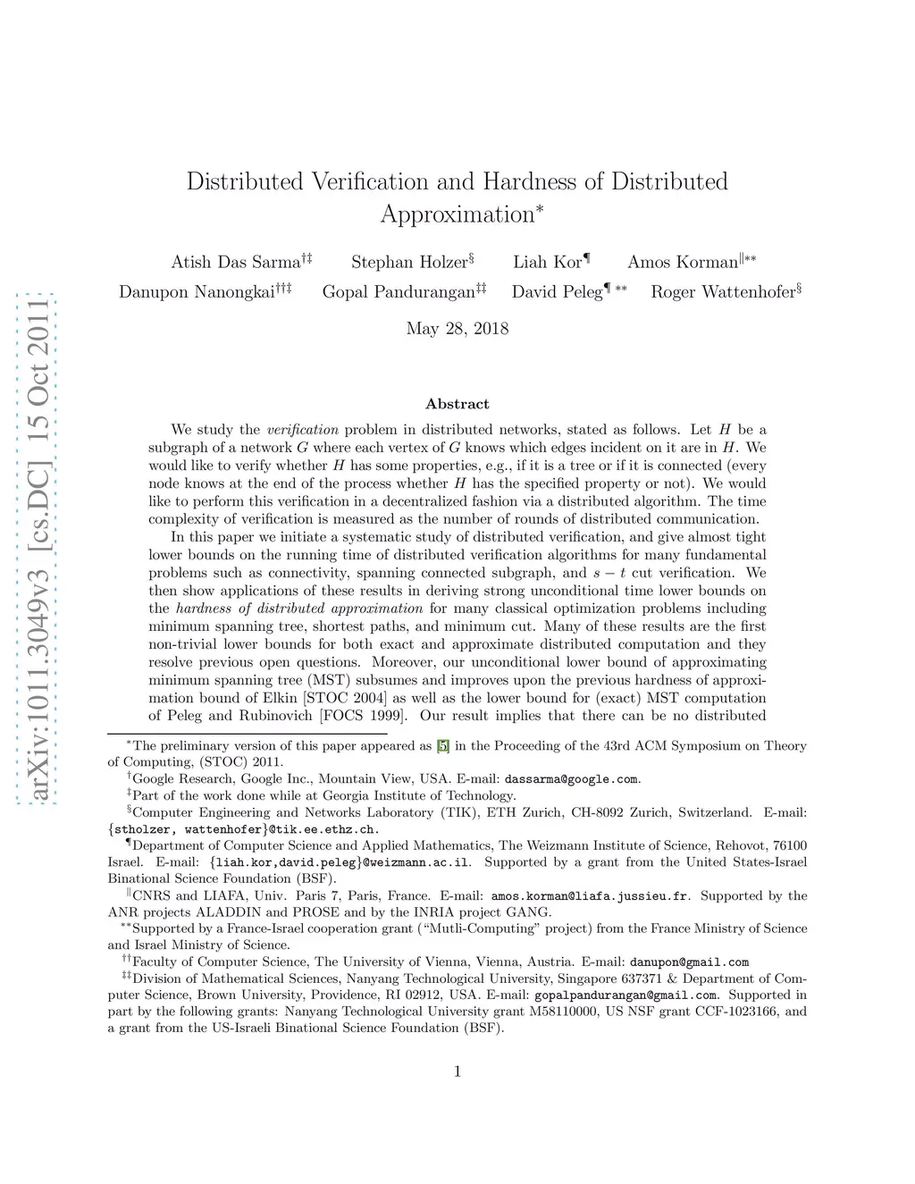 We study the {\em verification} problem in distributed networks, stated as follows. Let be a subgraph of a network where each vertex of knows which edges incident on it are in . We would like to verify whether has some properties, e.g., if it is a tree or if it is connected. We would like to perform this verification in a decentralized fashion via a distributed algorithm. The time complexity of verification is measured as the number of rounds of distributed communication. In this paper we initiate a systematic study of distributed verification, and give almost tight lower bounds on the running time of distributed verification algorithms for many fundamental problems such as connectivity, spanning connected subgraph, and cut verification. We then show applications of these results in deriving strong unconditional time lower bounds on the {\em hardness of distributed approximation} for many classical optimization problems including minimum spanning tree, shortest paths, and minimum cut. Many of these results are the first non-trivial lower bounds for both exact and approximate distributed computation and they resolve previous open questions. Moreover, our unconditional lower bound of approximating minimum spanning tree (MST) subsumes and improves upon the previous hardness of approximation bound of Elkin [STOC 2004] as well as the lower bound for (exact) MST computation of Peleg and Rubinovich [FOCS 1999]. Our result implies that there can be no distributed approximation algorithm for MST that is significantly faster than the current exact algorithm, for {\em any} approximation factor. Our lower bound proofs show an interesting connection between communication complexity and distributed computing which turns out to be useful in establishing the time complexity of exact and approximate distributed computation of many problems.