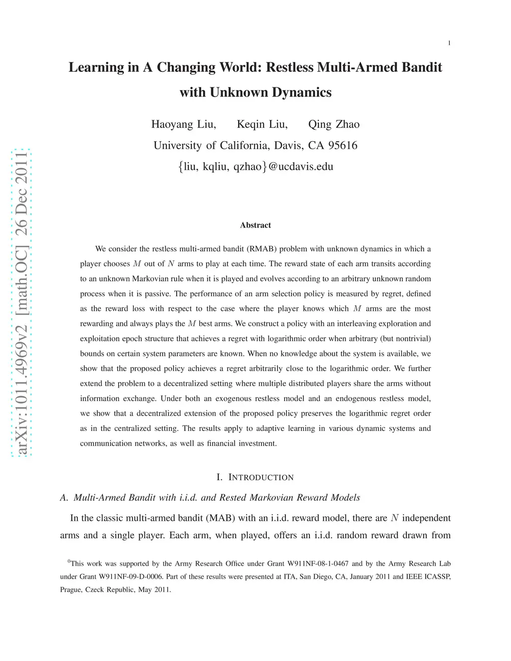 Learning in A Changing World: Restless Multi-Armed Bandit with Unknown