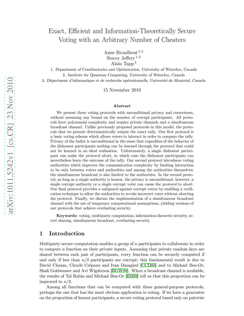 We present three voting protocols with unconditional privacy and correctness, without assuming any bound on the number of corrupt participants. All protocols have polynomial complexity and require private channels and a simultaneous broadcast channel. Unlike previously proposed protocols in this model, the protocols that we present deterministically output the exact tally. Our first protocol is a basic voting scheme which allows voters to interact in order to compute the tally. Privacy of the ballot is unconditional in the sense that regardless of the behavior of the dishonest participants nothing can be learned through the protocol that could not be learned in an ideal realisation. Unfortunately, a single dishonest participant can make the protocol abort, in which case the dishonest participants can nevertheless learn the outcome of the tally. Our second protocol introduces voting authorities which improves the communication complexity by limiting interaction to be only between voters and authorities and among the authorities themselves; the simultaneous broadcast is also limited to the authorities. In the second protocol, as long as a single authority is honest, the privacy is unconditional, however, a single corrupt authority or a single corrupt voter can cause the protocol to abort. Our final protocol provides a safeguard against corrupt voters by enabling a verification technique to allow the authorities to revoke incorrect votes without aborting the protocol. Finally, we discuss the implementation of a simultaneous broadcast channel with the use of temporary computational assumptions, yielding versions of our protocols that achieve everlasting security.